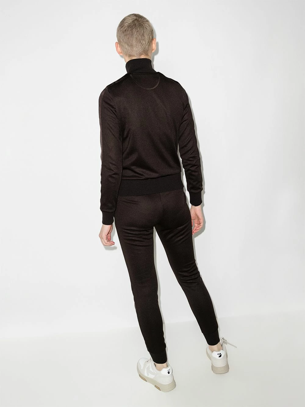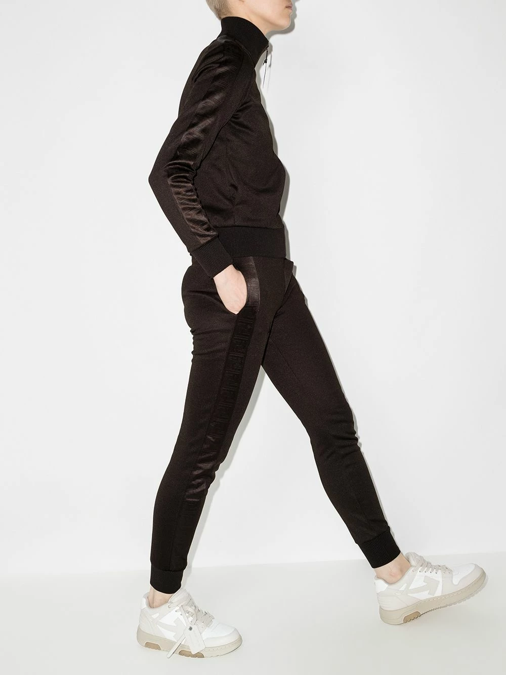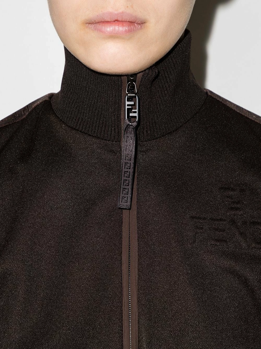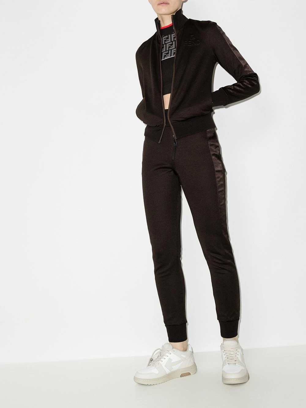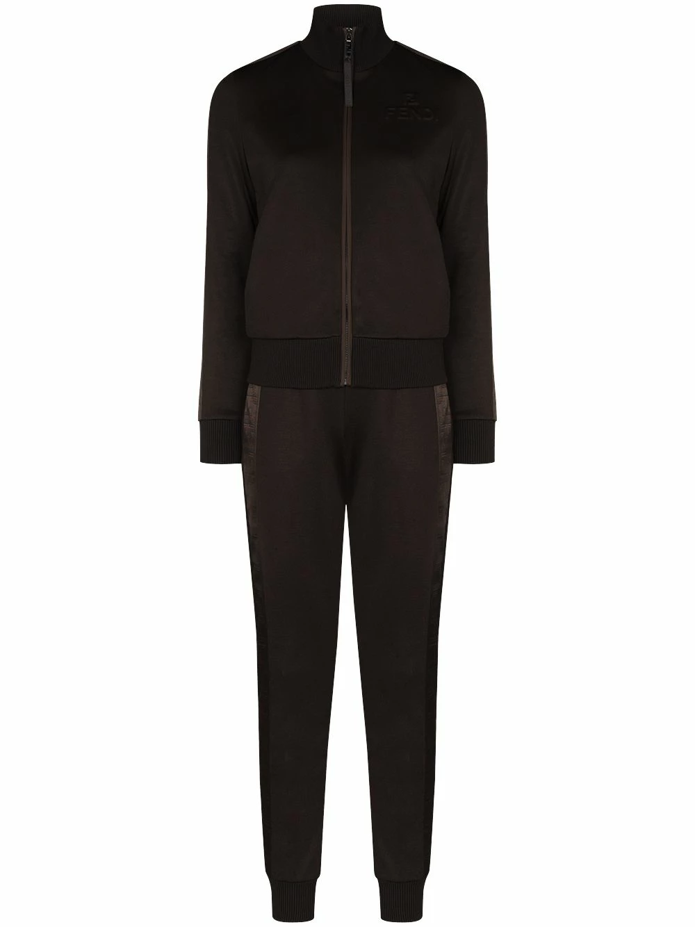 Fendi adds a luxe appeal to the sporty silhouette of this tracksuit by adding iconic branding details. Adorned with the signature FF-logo, this set of two pieces is composed by a zip-up jacket and tapered trousers.
