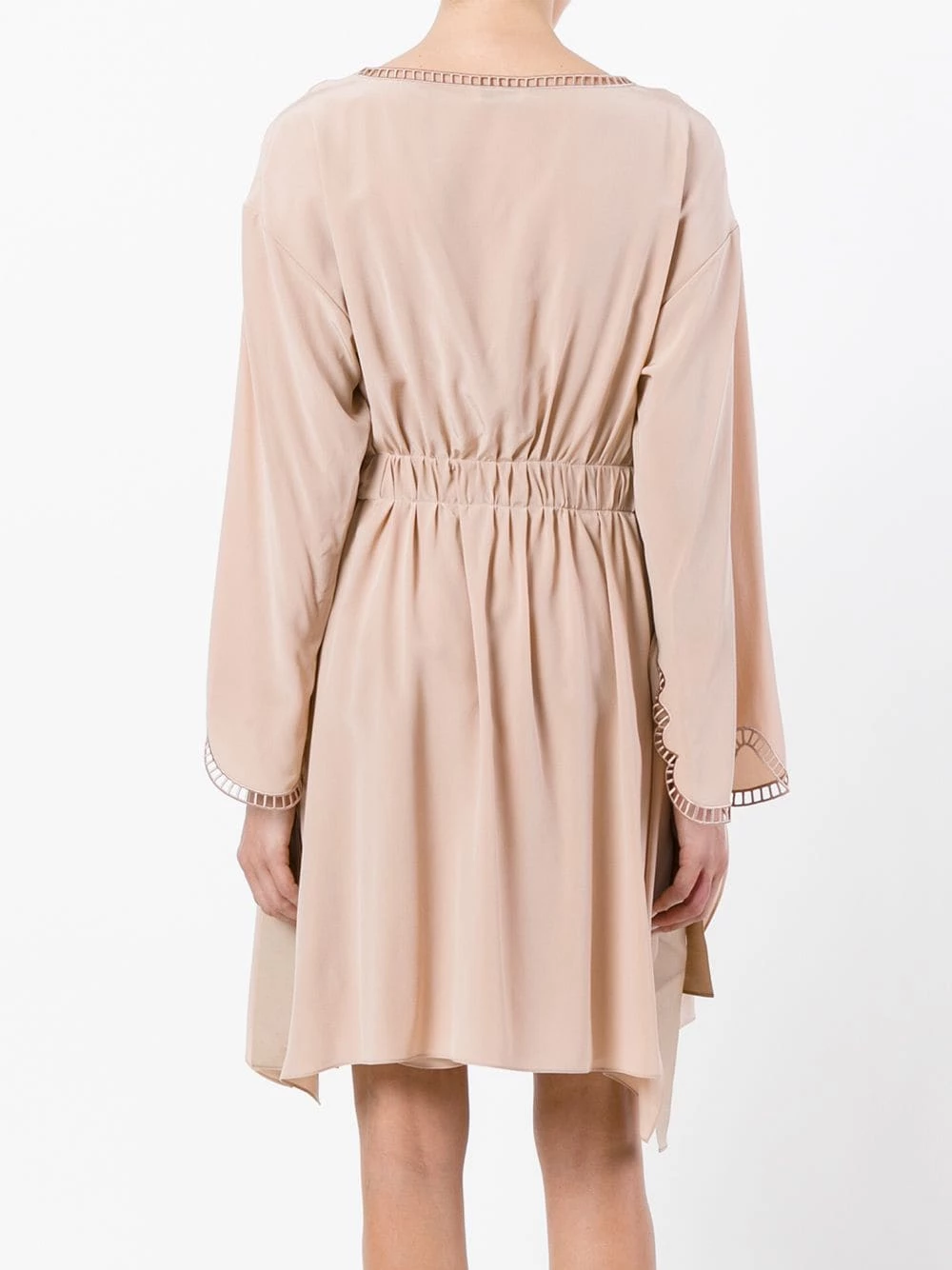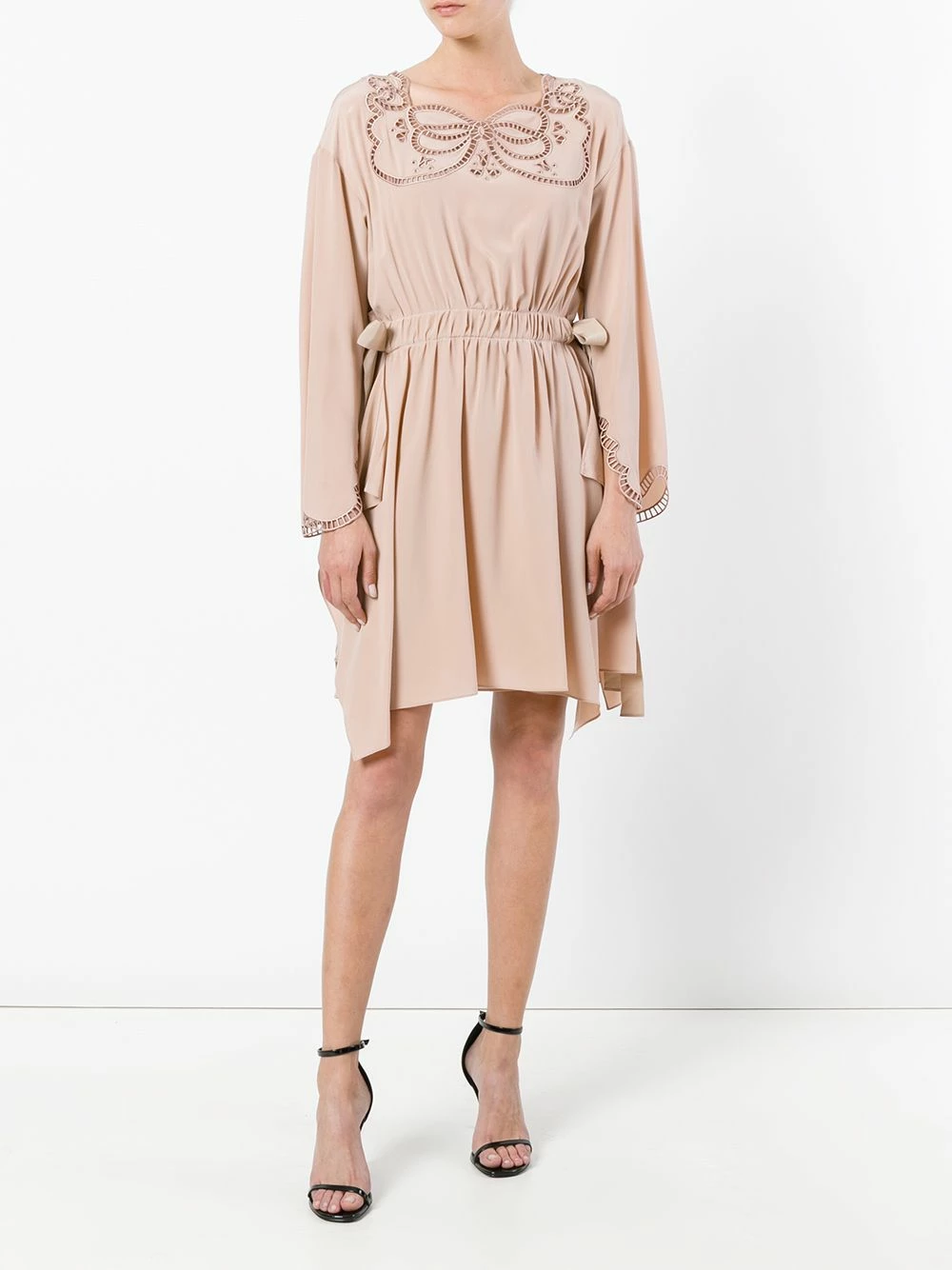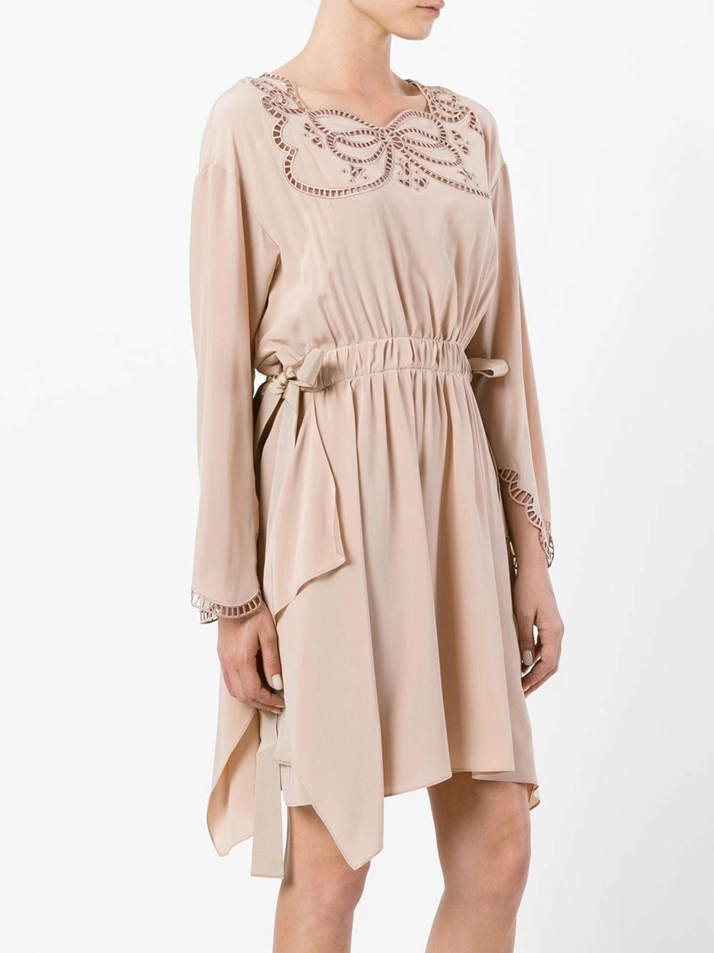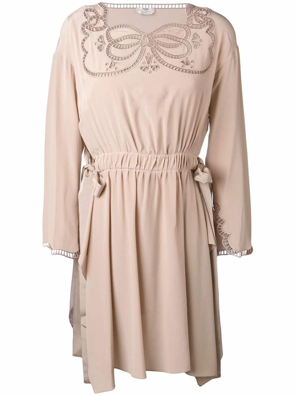 p.p1 {margin: 0.0px 0.0px 0.0px 0.0px; font: 12.0px Helvetica; color: #454545} The Fendi collection features playfully striking detailing, elaborating the elegantly decadent spirit of the brand. This nude coloured silk shift dress features a square embroidered neckline, long sleeves, a belted waist and a pleated design.