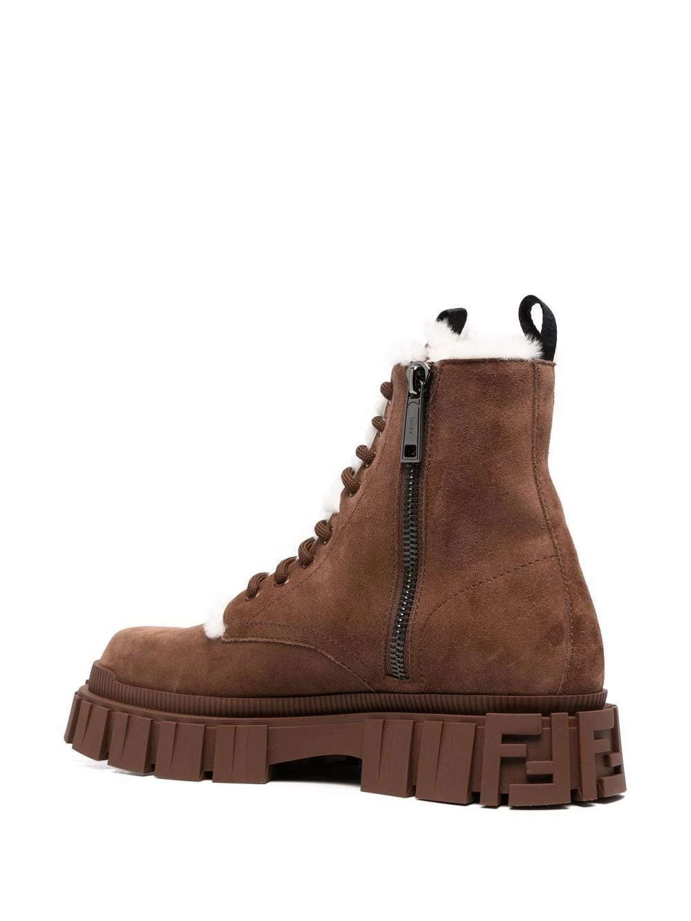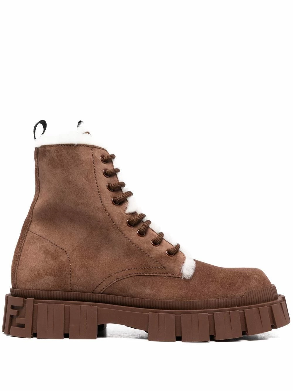 Crafted from brown calf leather and sheepskin, these boots from Fendi embody the brand’s historical references. Branding is evident in the chunky rubber sole.Β