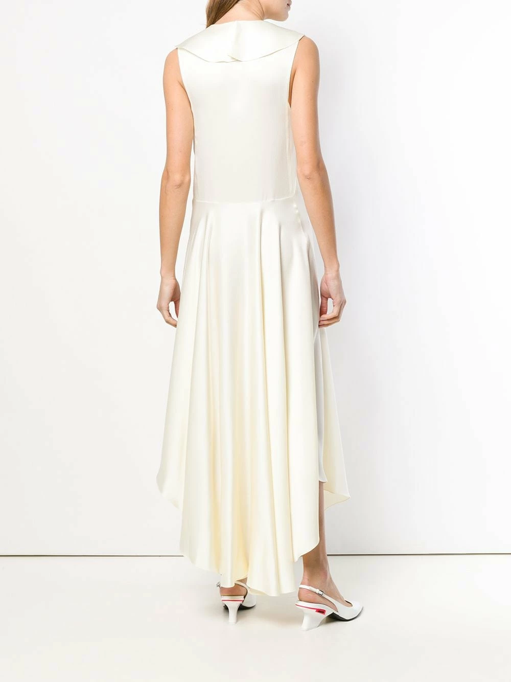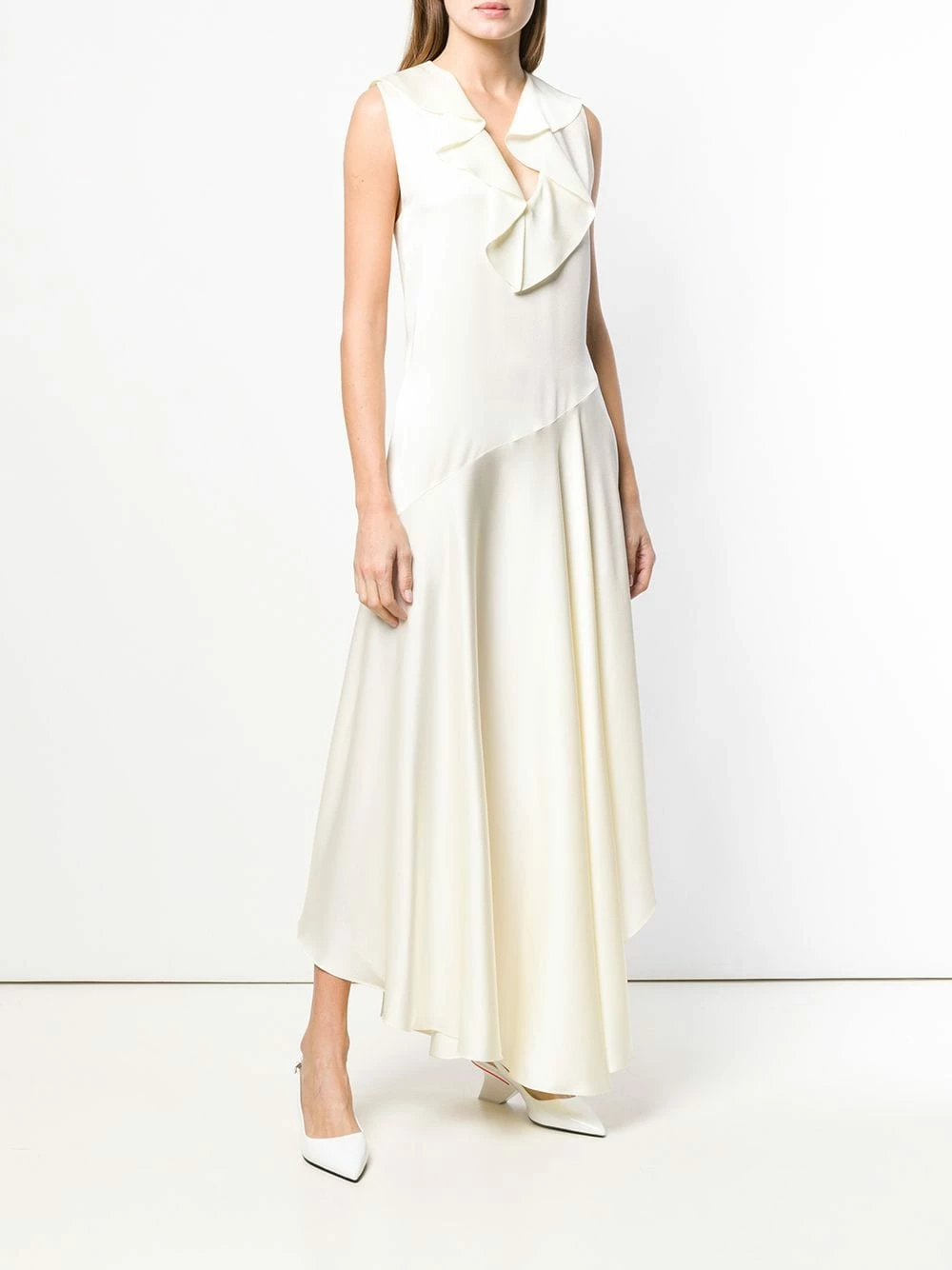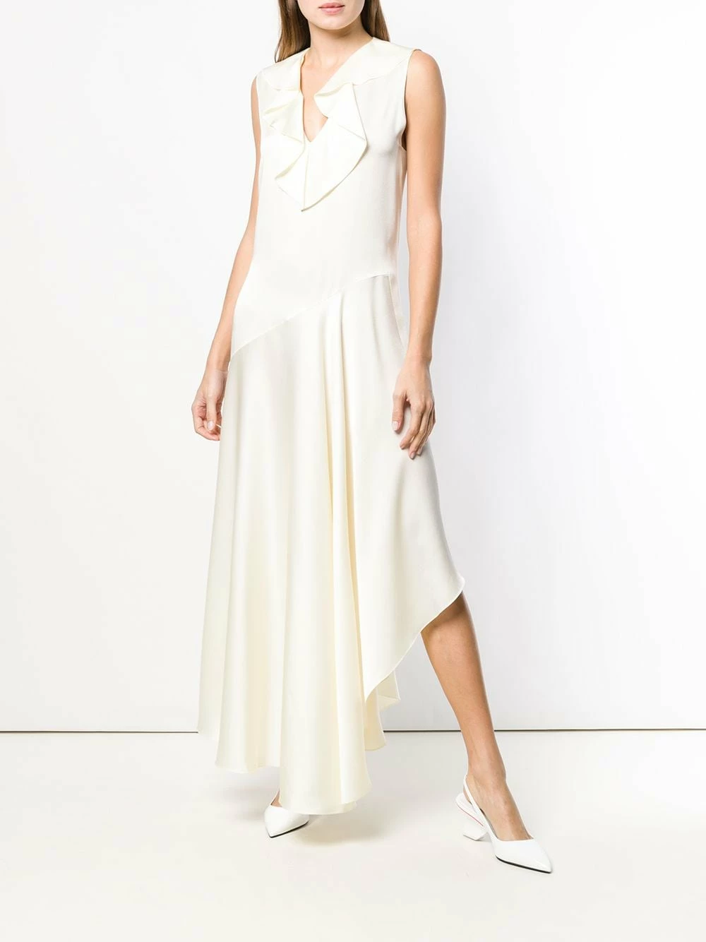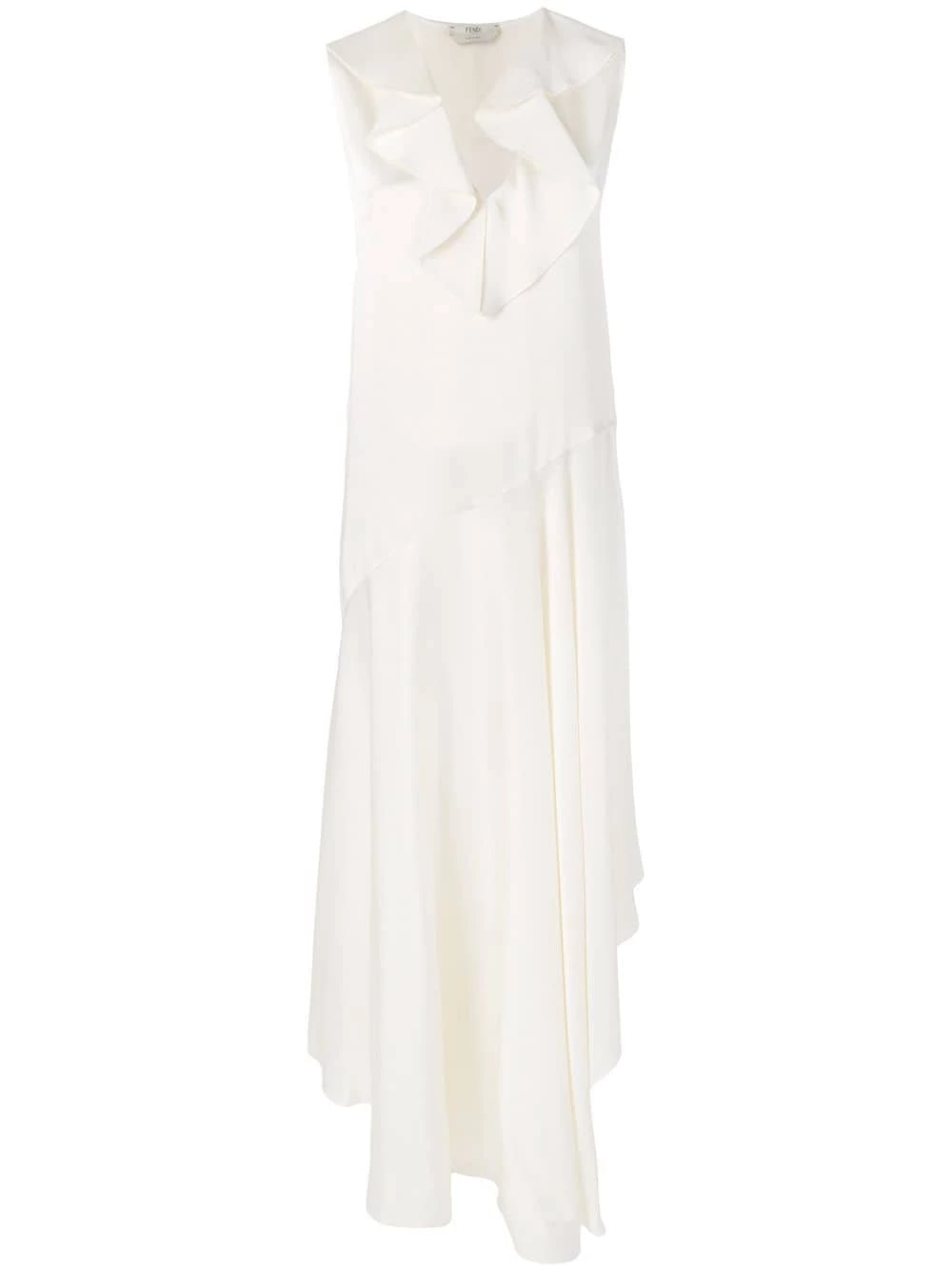 Fendi takes inspiration from the trend of the moment – reconstruction. The result? An elegante cascading evening dress with an asymmetric finishing touch. Fashioned in Italy in a milk white hue, this asymmetric bias cut dress from Fendi boasts a soft ruffled neck, a sleeveless design, a bias cut finish, a flared skirt, an asymmetric hem and a long length.