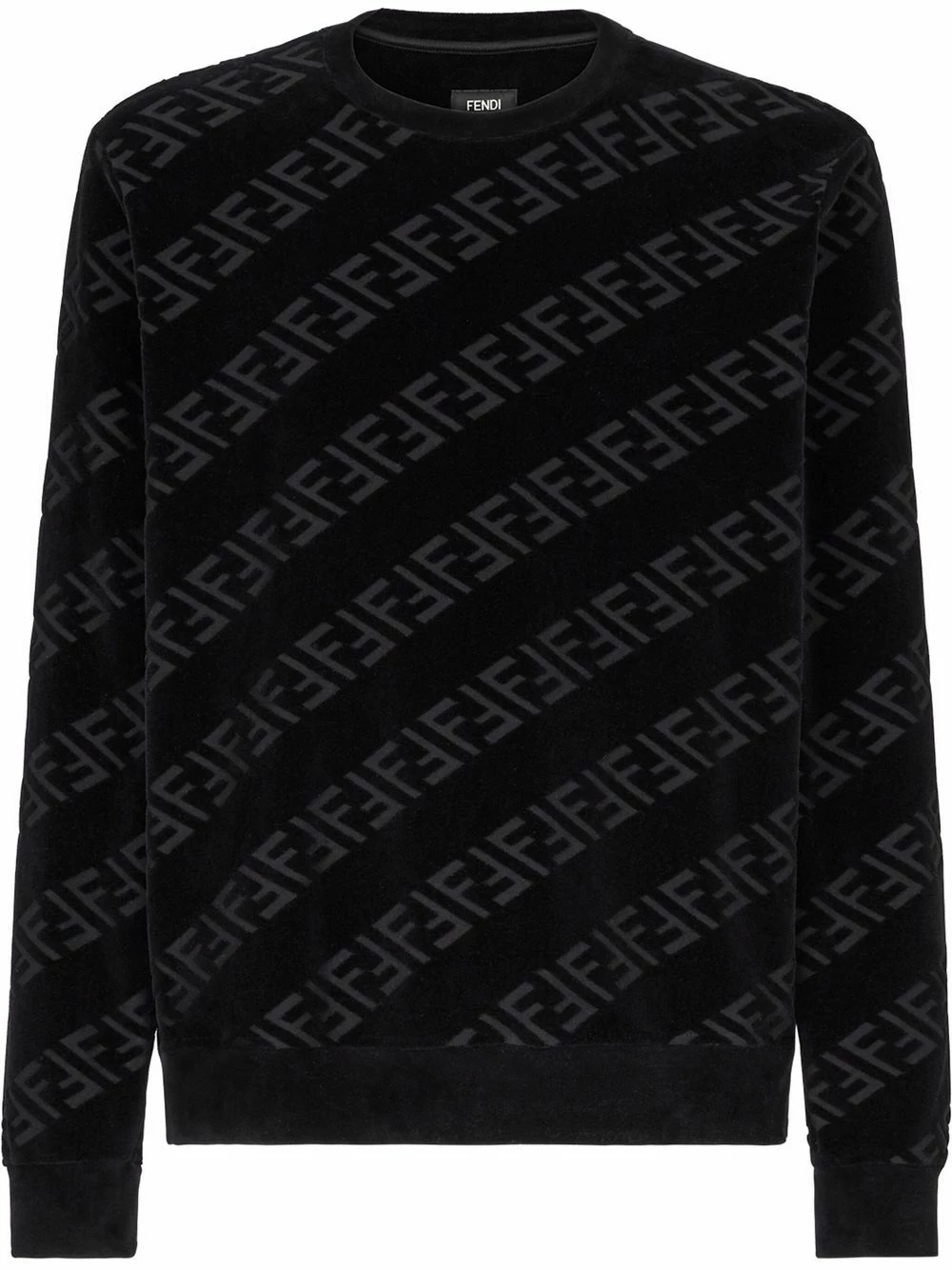 Fendi is a fashion label synonymous with luxury and bold designs. Made of black velvet all-over, this crew-neck sweatshirt is decorated with a diagonal FF motif inlay.Β