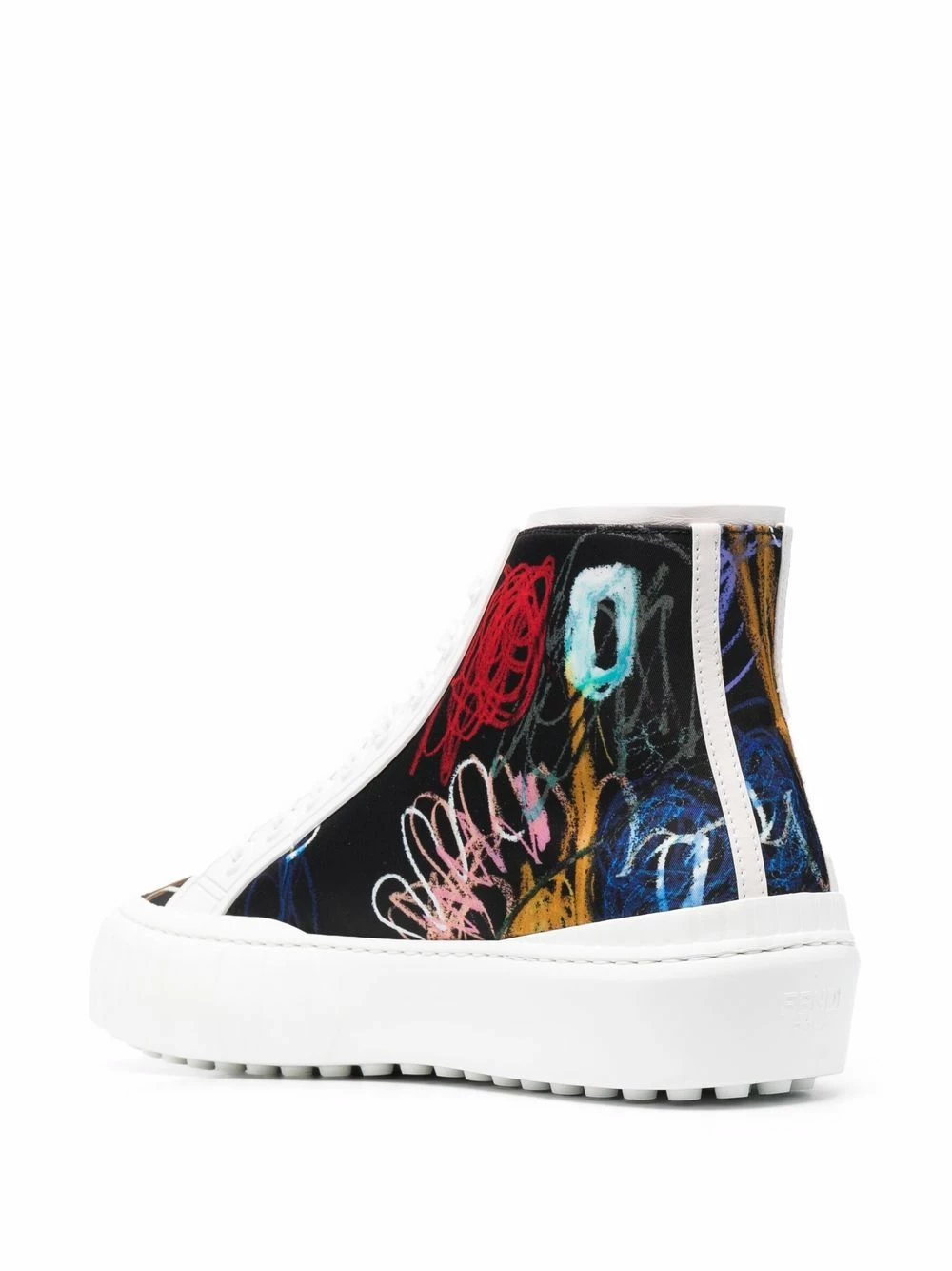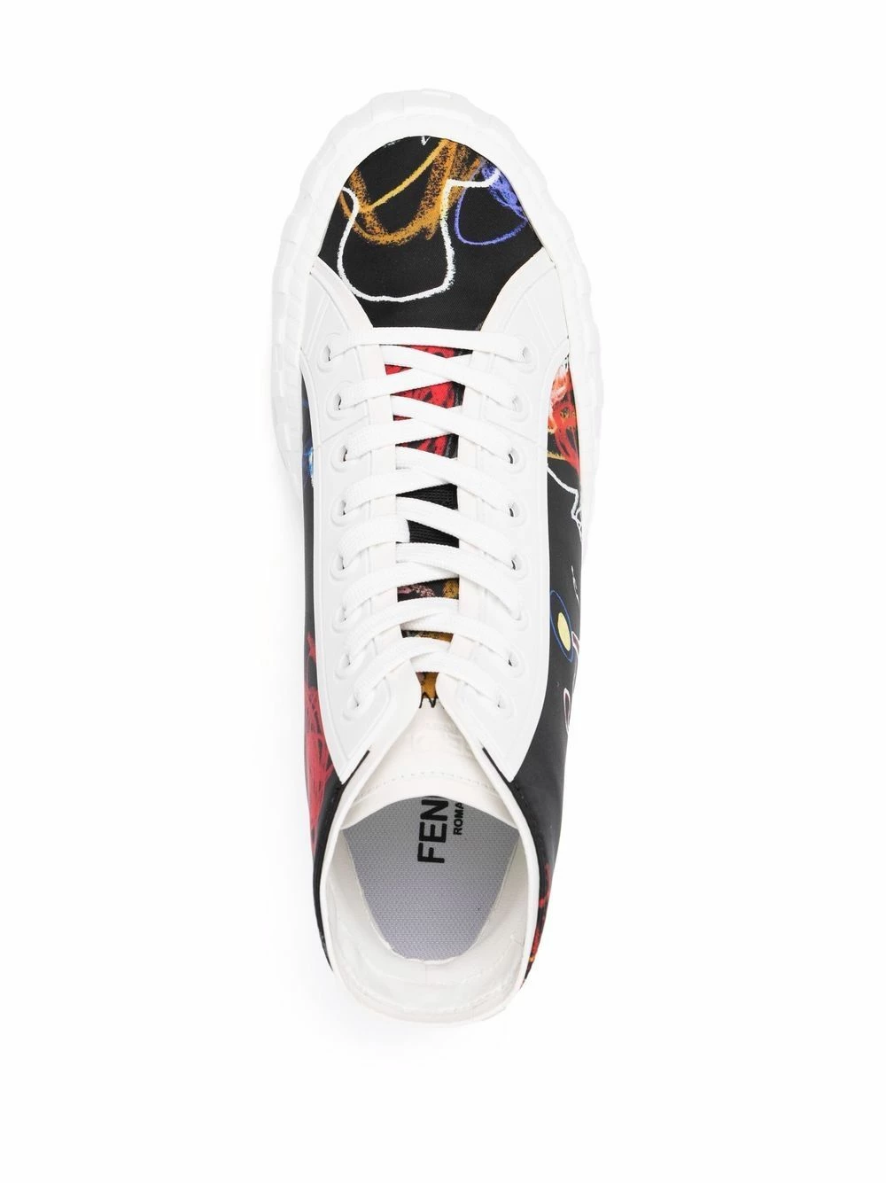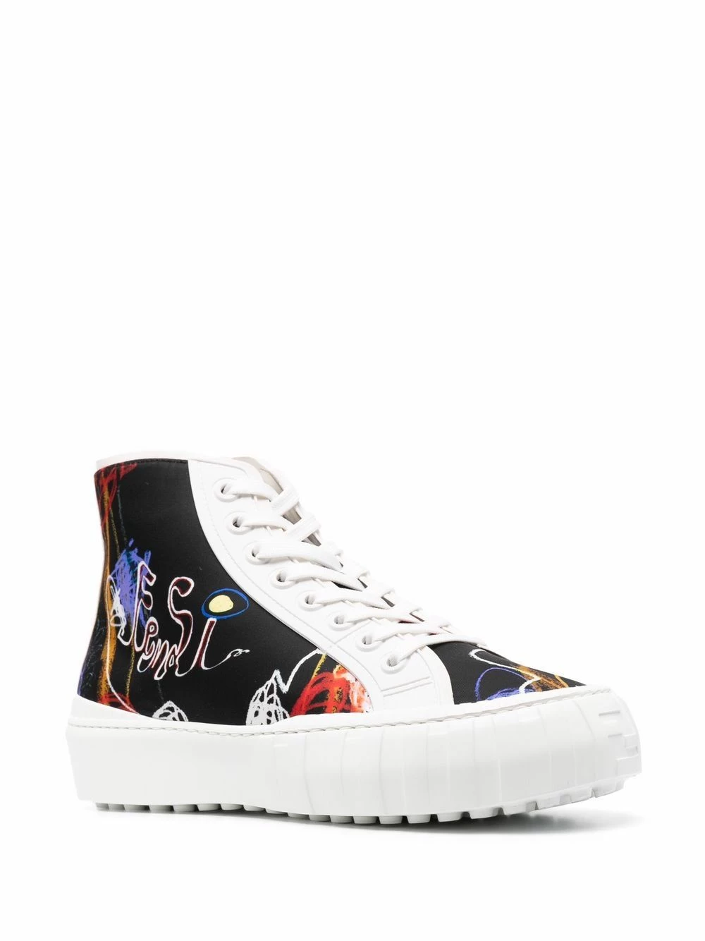 Fendi showcases their creative flair through this pair of Force print high-top sneakers from their AW21 collection. A scribbled-style logo covers the side of this footwear and sits upon a stable ridged rubber sole.Β