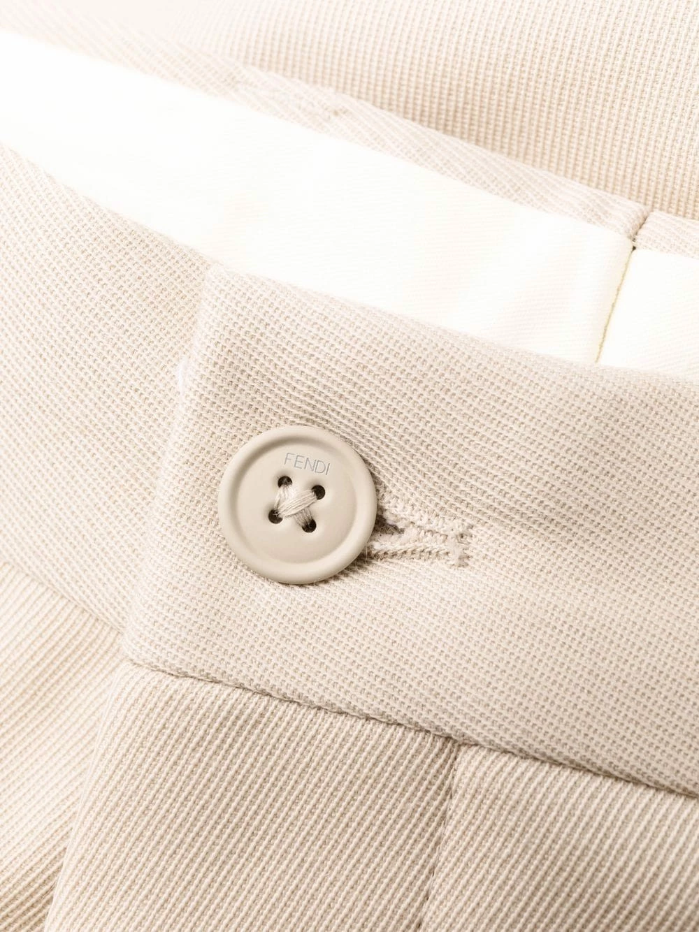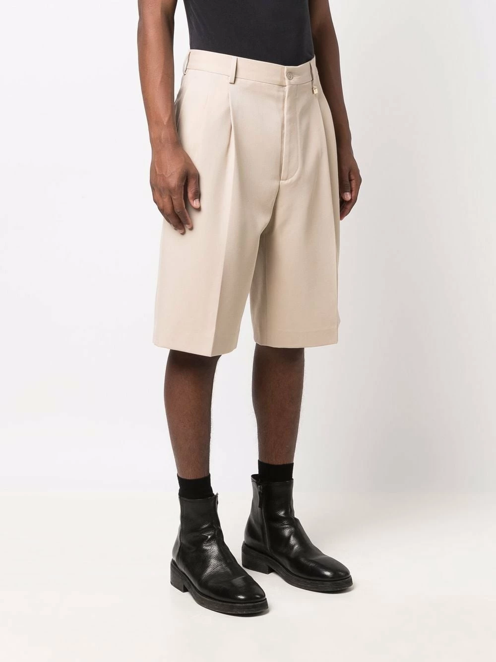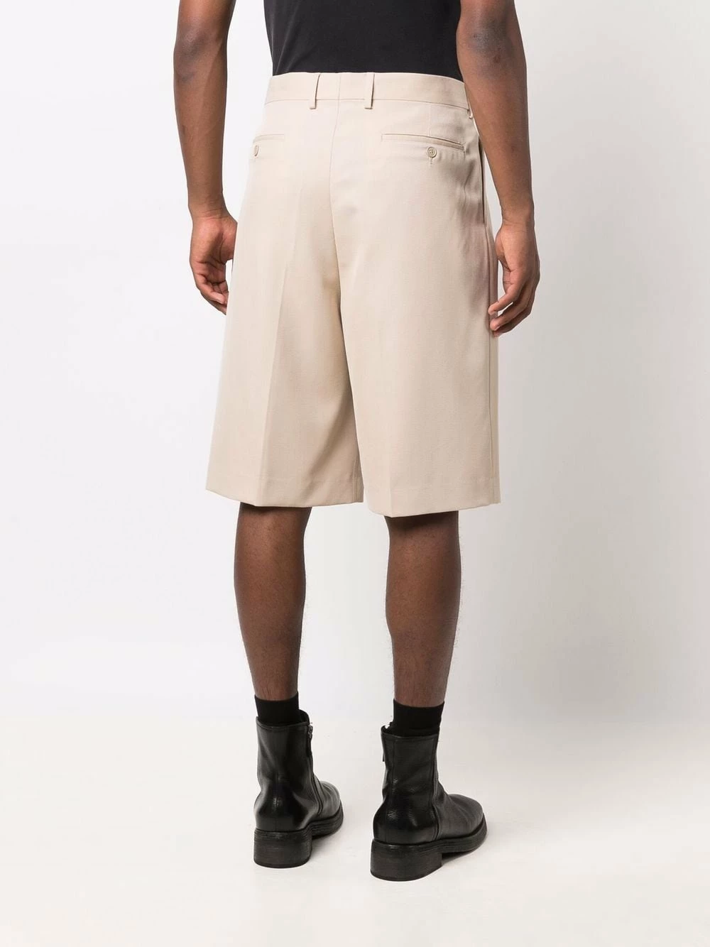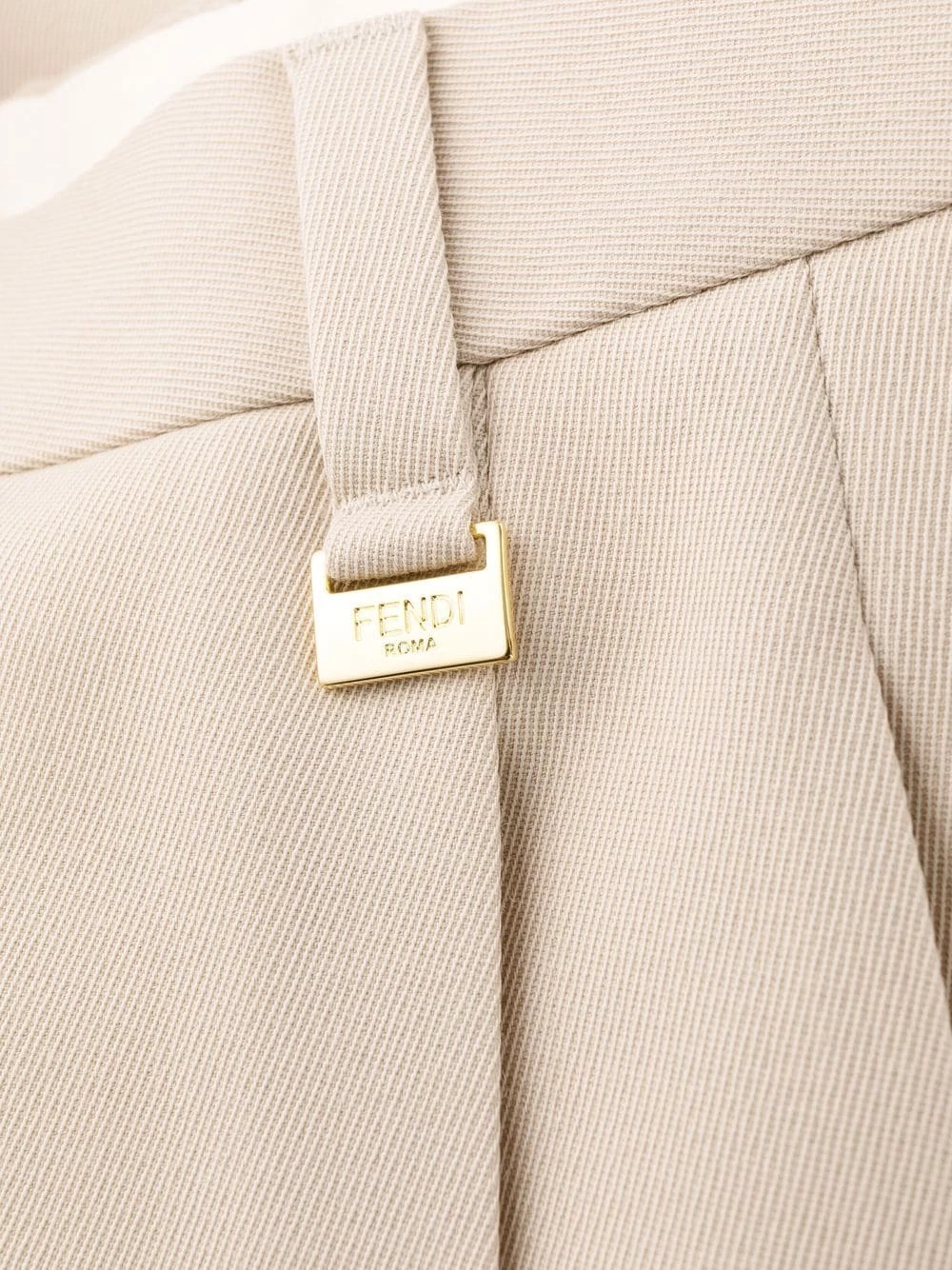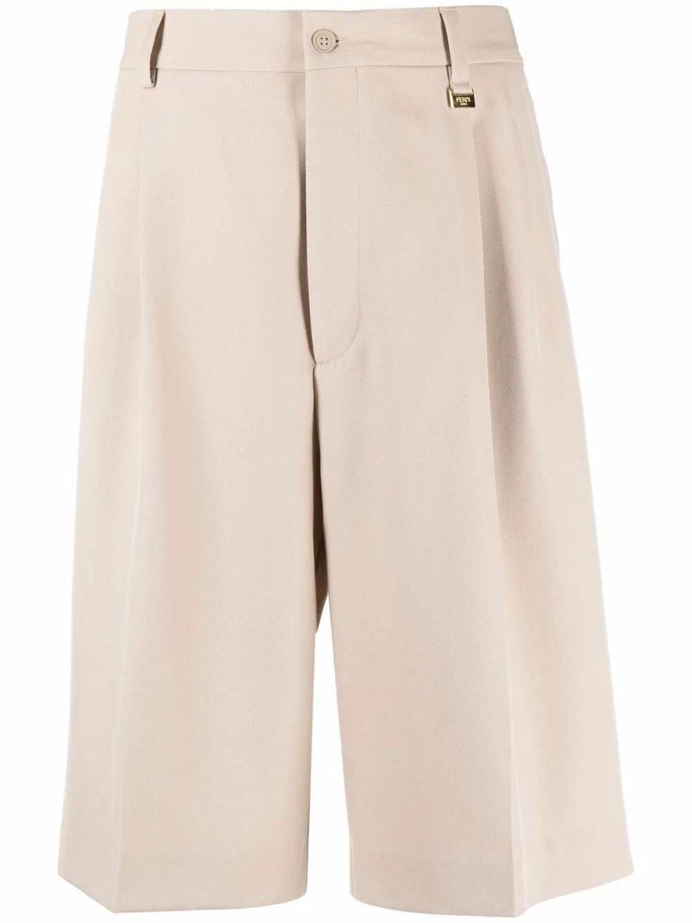 These shorts from Fendi boast a tailored edge with their knee-length silhouette and pleat details towards the front. A gold-tone engraved logo charm can be seen hanging from the belt loop of these beige virgin wool blend shorts.
