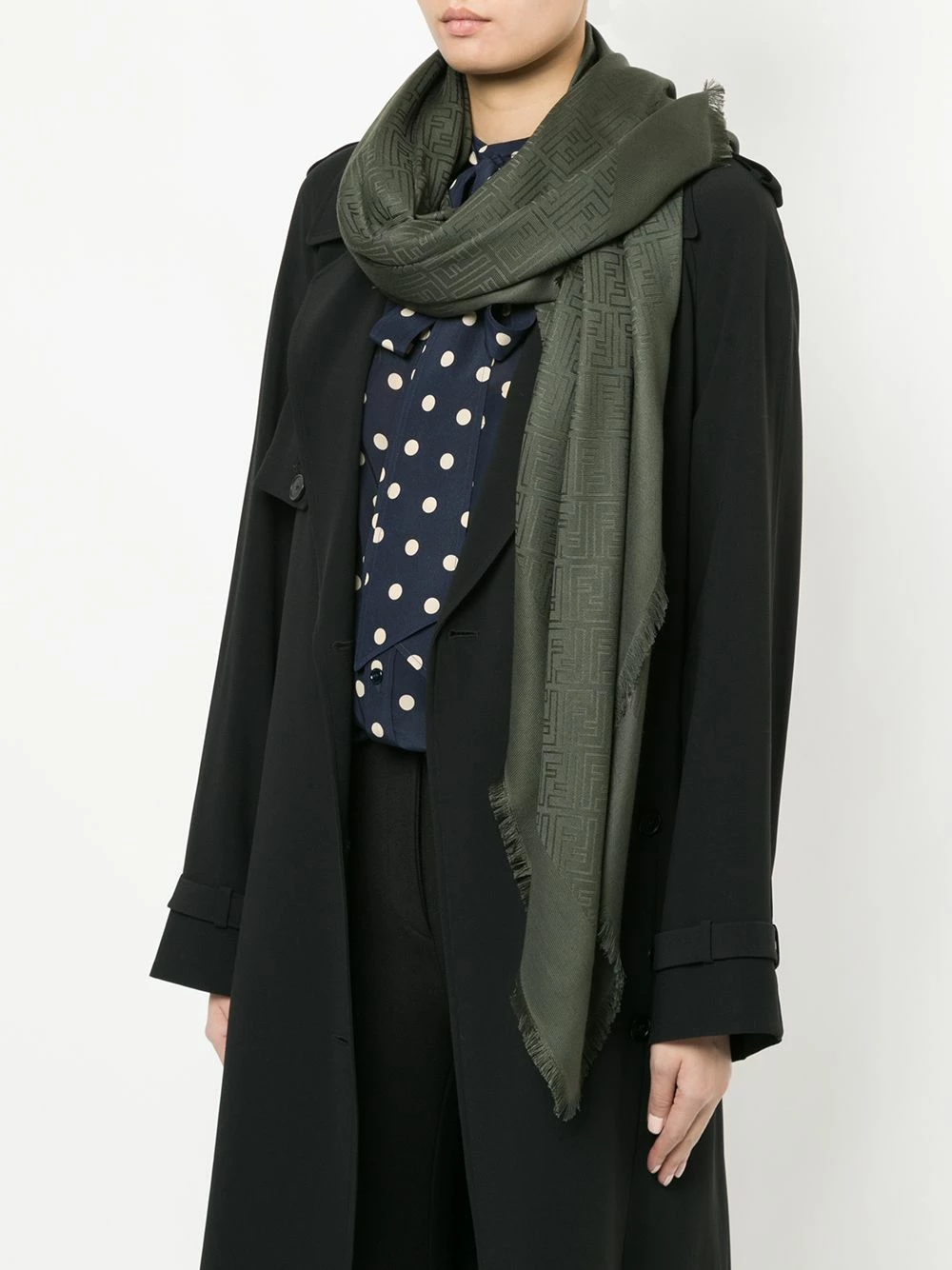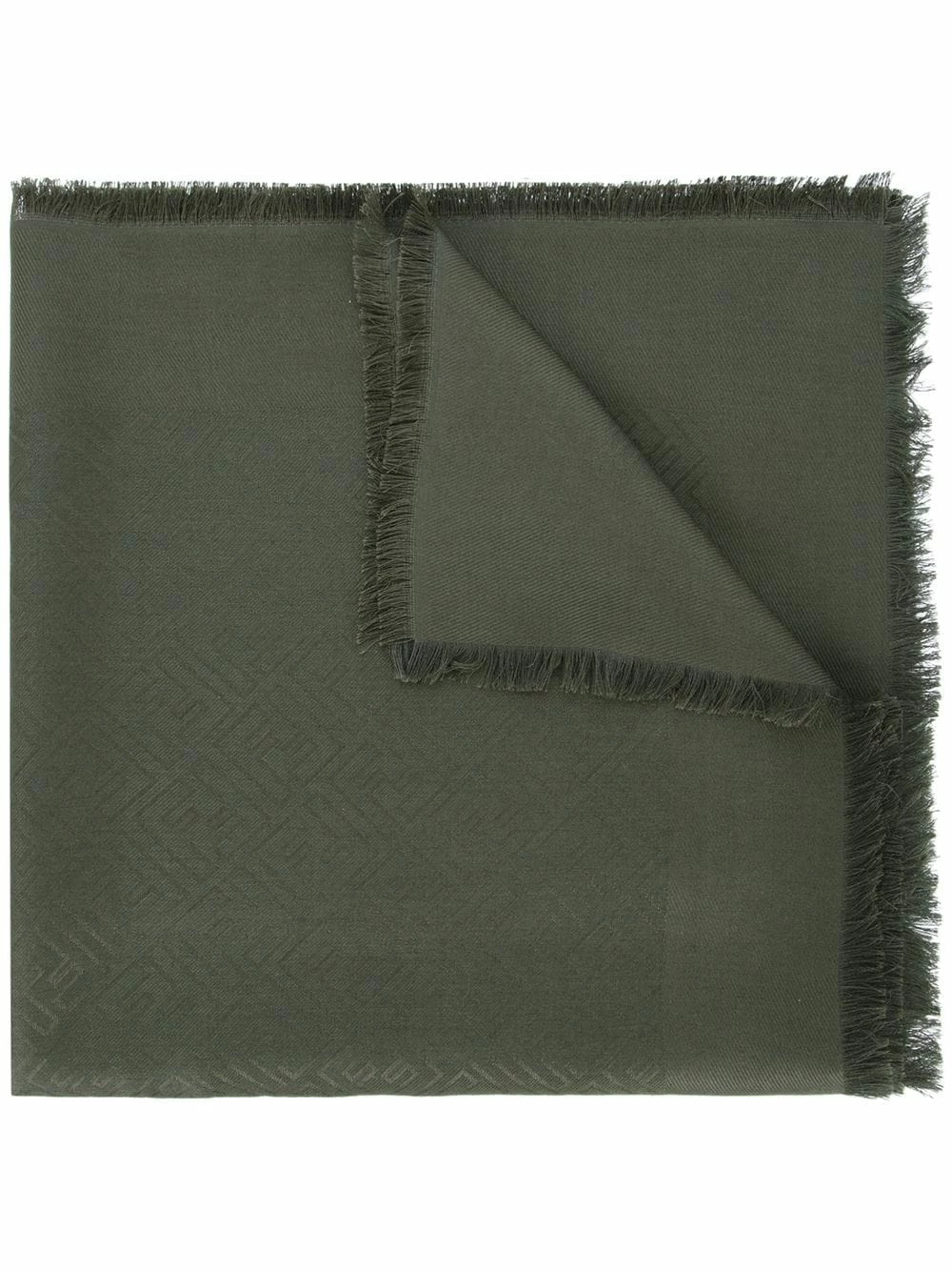 Italian fashion house Fendi is famed for its extravagance and exquisite designs crafted from the most luxurious materials. This green silk-wool blend signature shawl features frayed edges and FF motif.