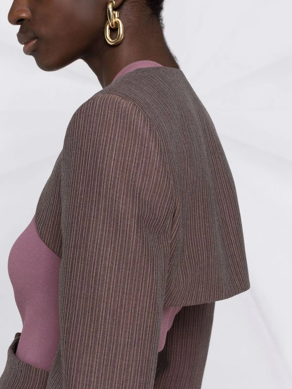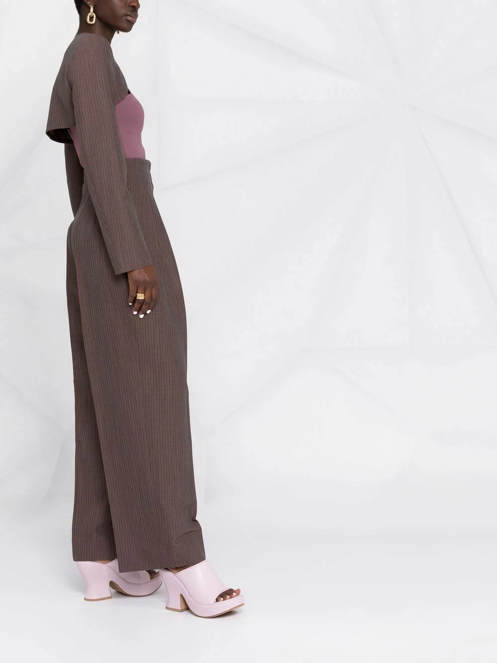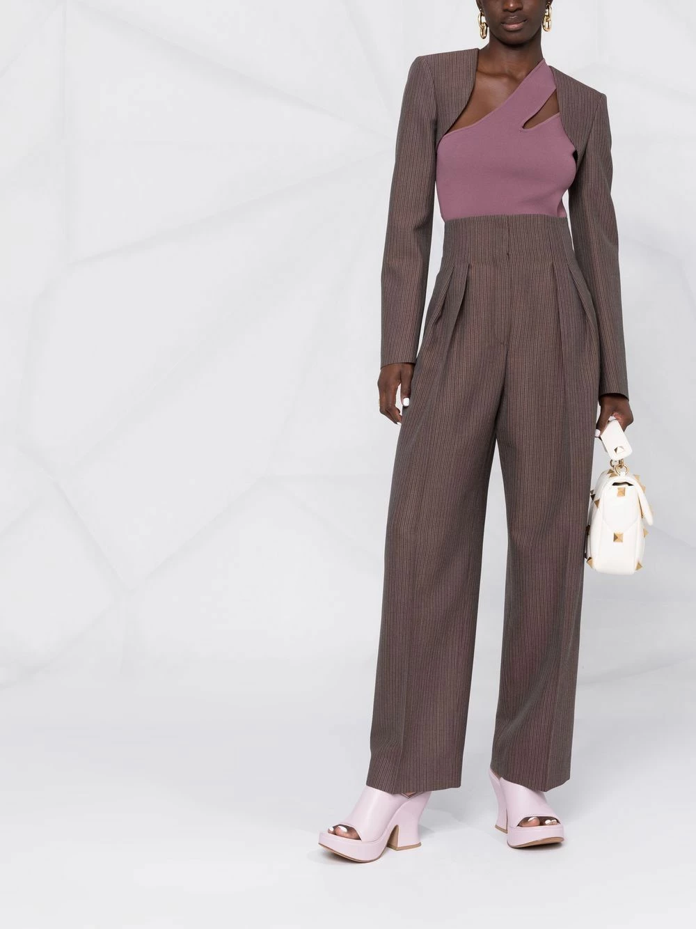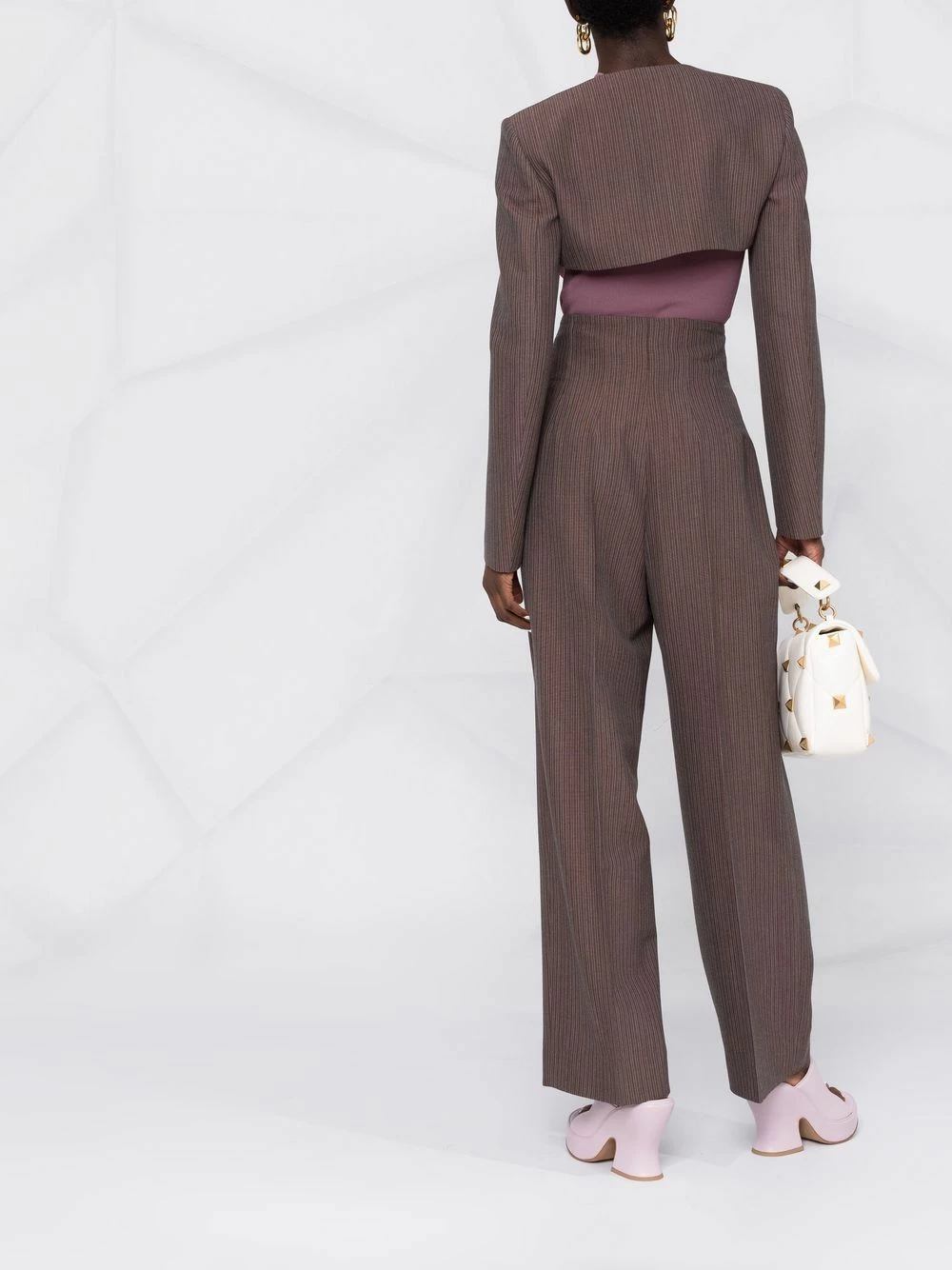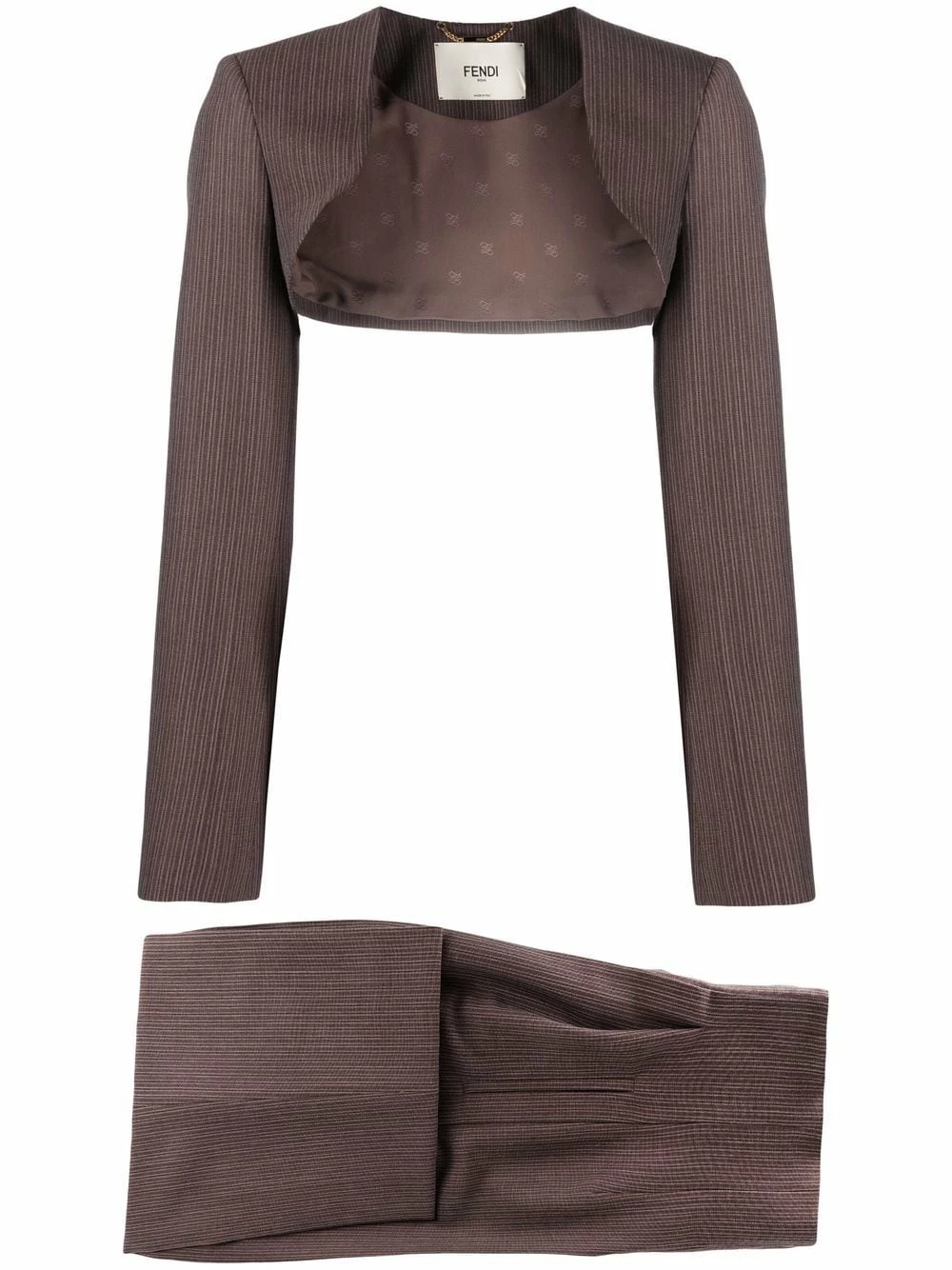 Taking inspiration from Menswear, Fendi deconstructs the classic tailored suit. Crafted in wool with a silk lining, it features a timeless pinstripe brown pattern and consists of a bolero jacket with long sleeves and shoulder pads, which pairs with ultra high-waisted trousers cut with a straight leg and detailed with pressed creases to the front and back.Β