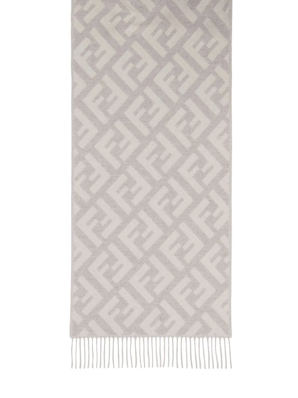 Fendi is famous for creating playful and emblematic designs that are meant to add elegance and luxury to your wardrobe, as showcased by this light grey and white cashmere long FF logo scarf. Featuring fringed edges and all-over FF logos.