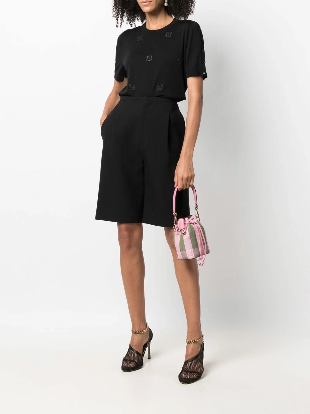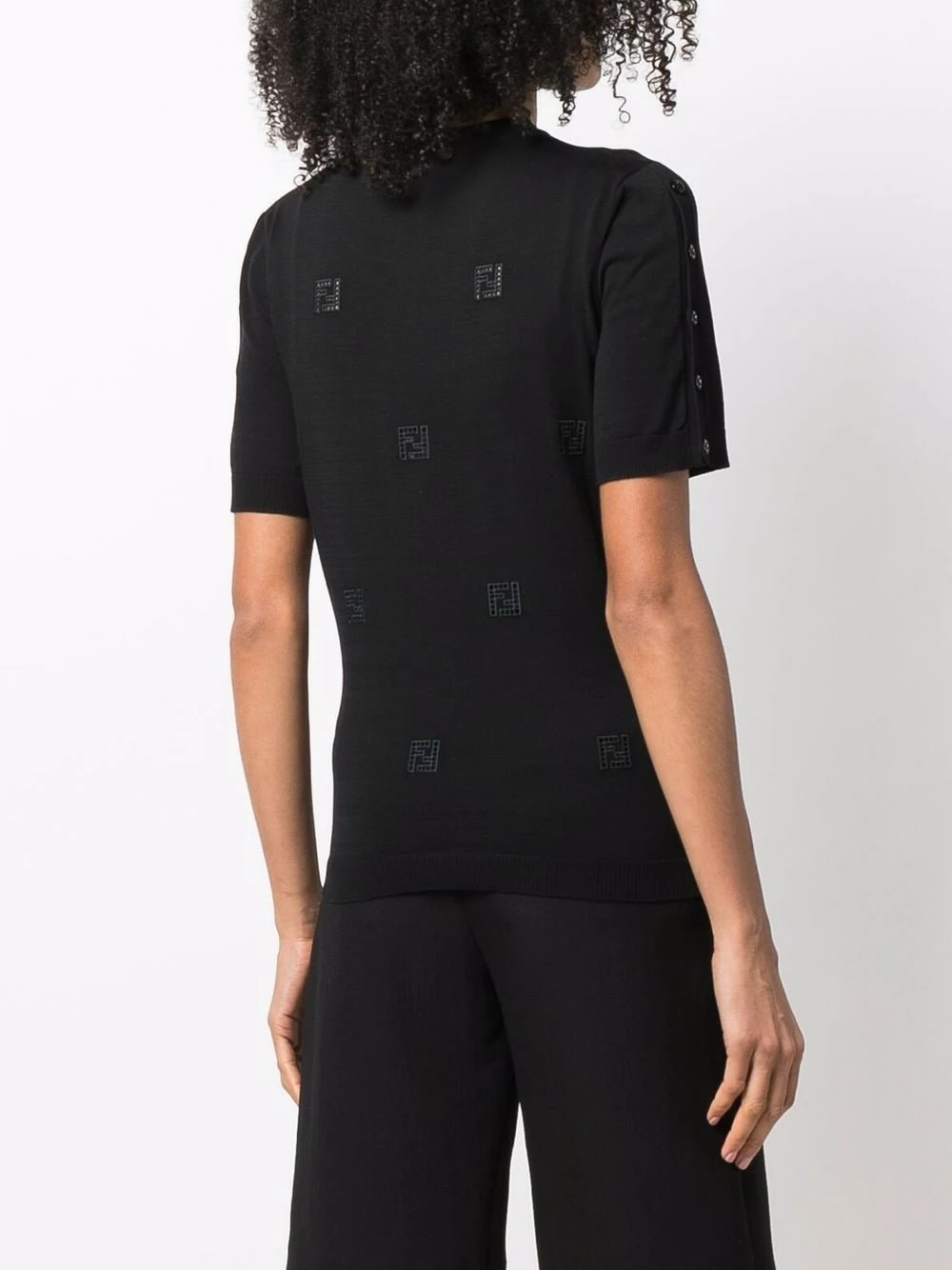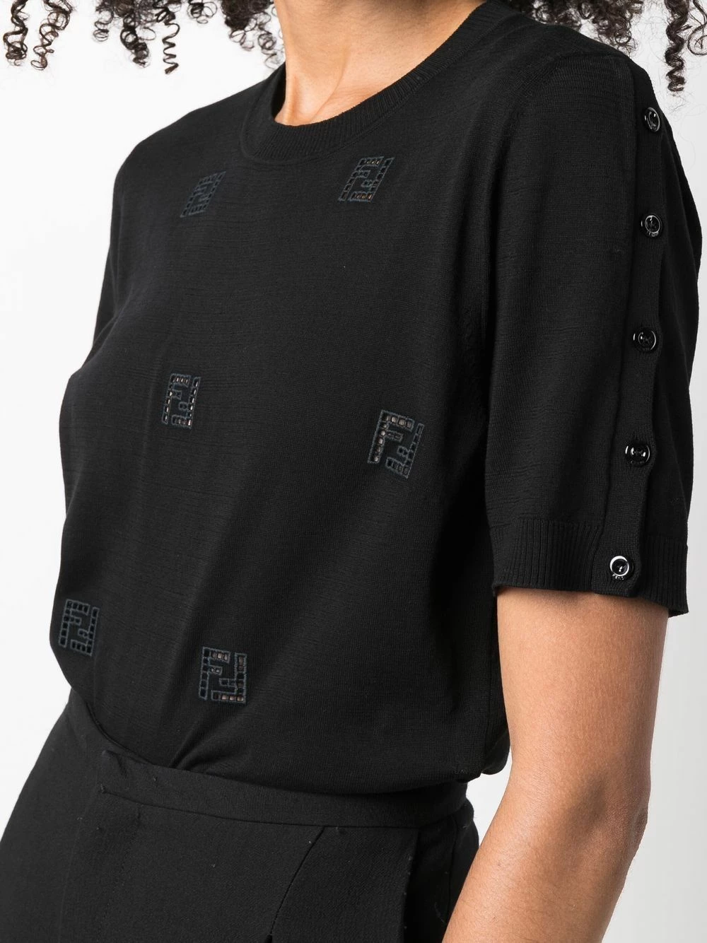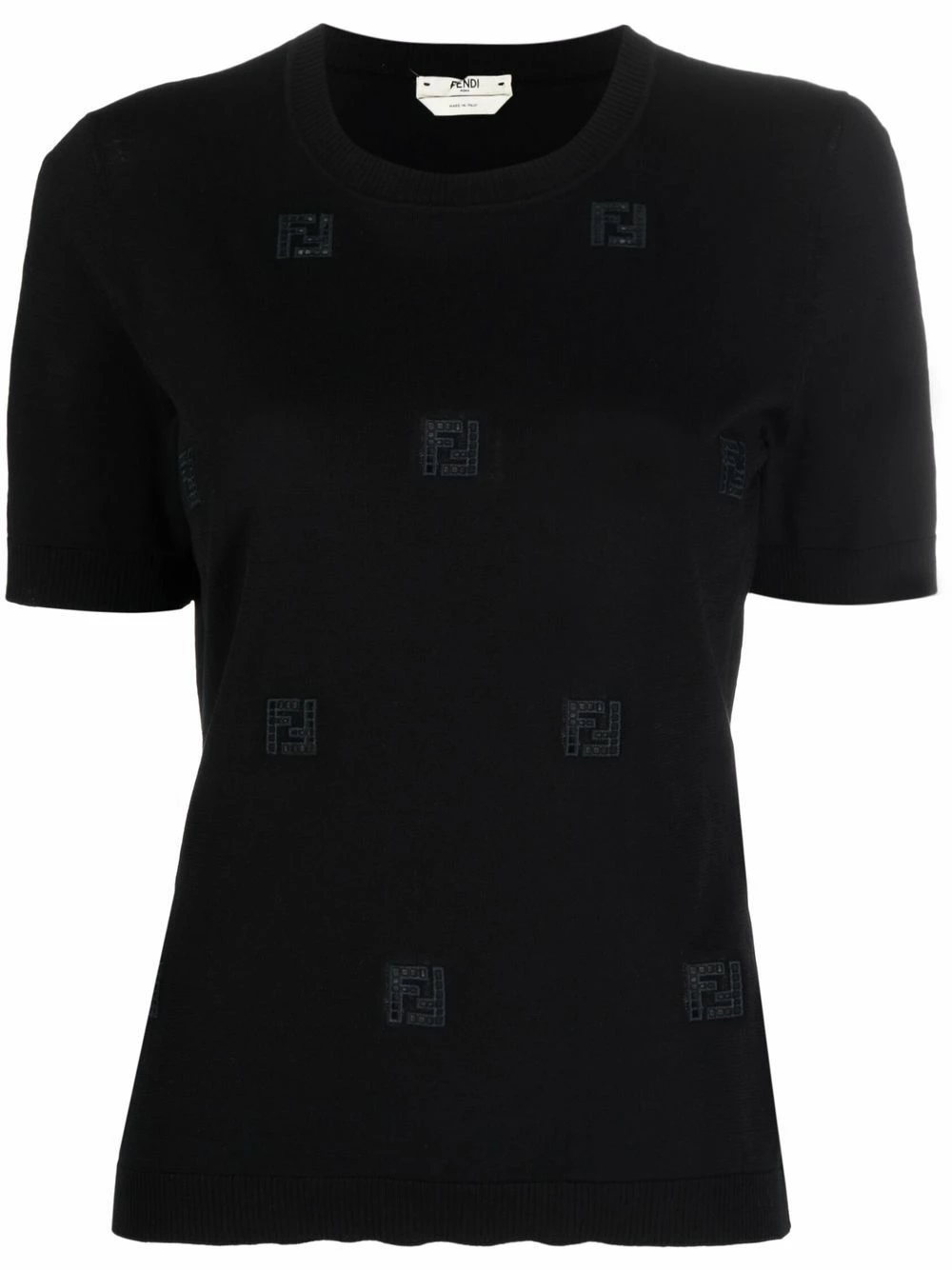 Crafted in Italy from black cotton, this round neck knitted top from Fendi celebrates the brands signature FF logo with broderie anglaise embroidered motifs.Β