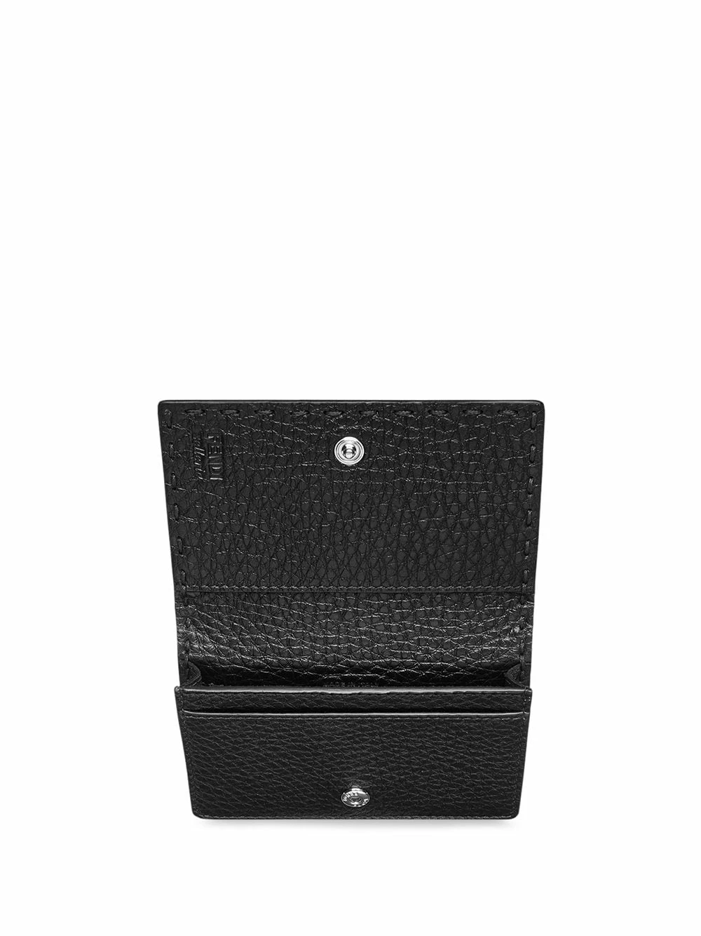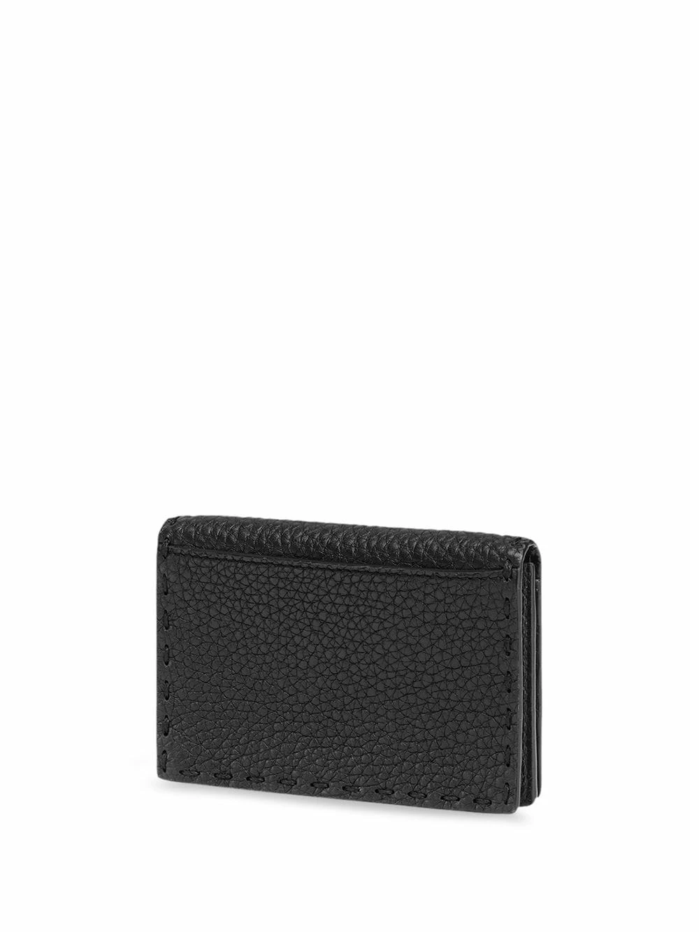 Carry your cards with this discreet and compact black leather foldover cardholder from Fendi. Stitches you can get onboard with. Featuring a foldover top with snap closure, multiple card slots and metal stitch details.