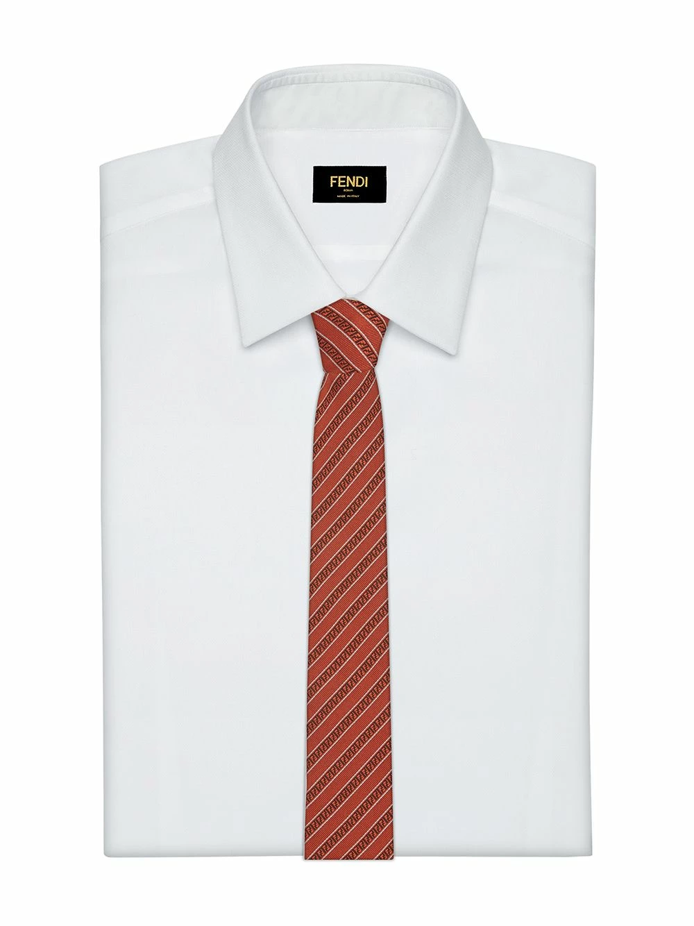 Elevate your smart looks with Fendi. This dark orange silk jacquard-woven tie makes a sharp addition to your ensembles. It’s all in the details.