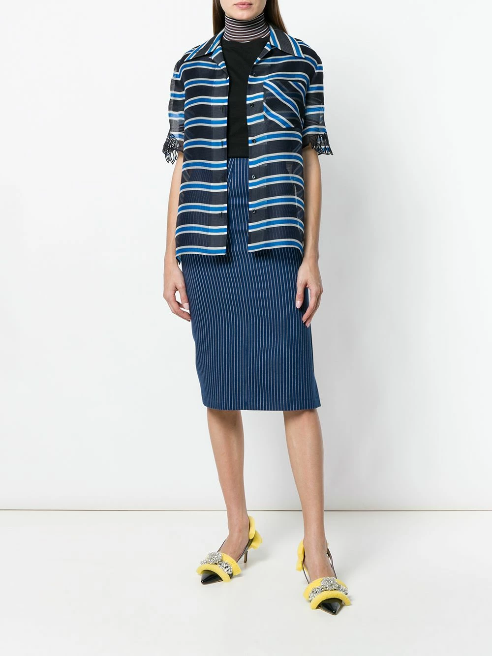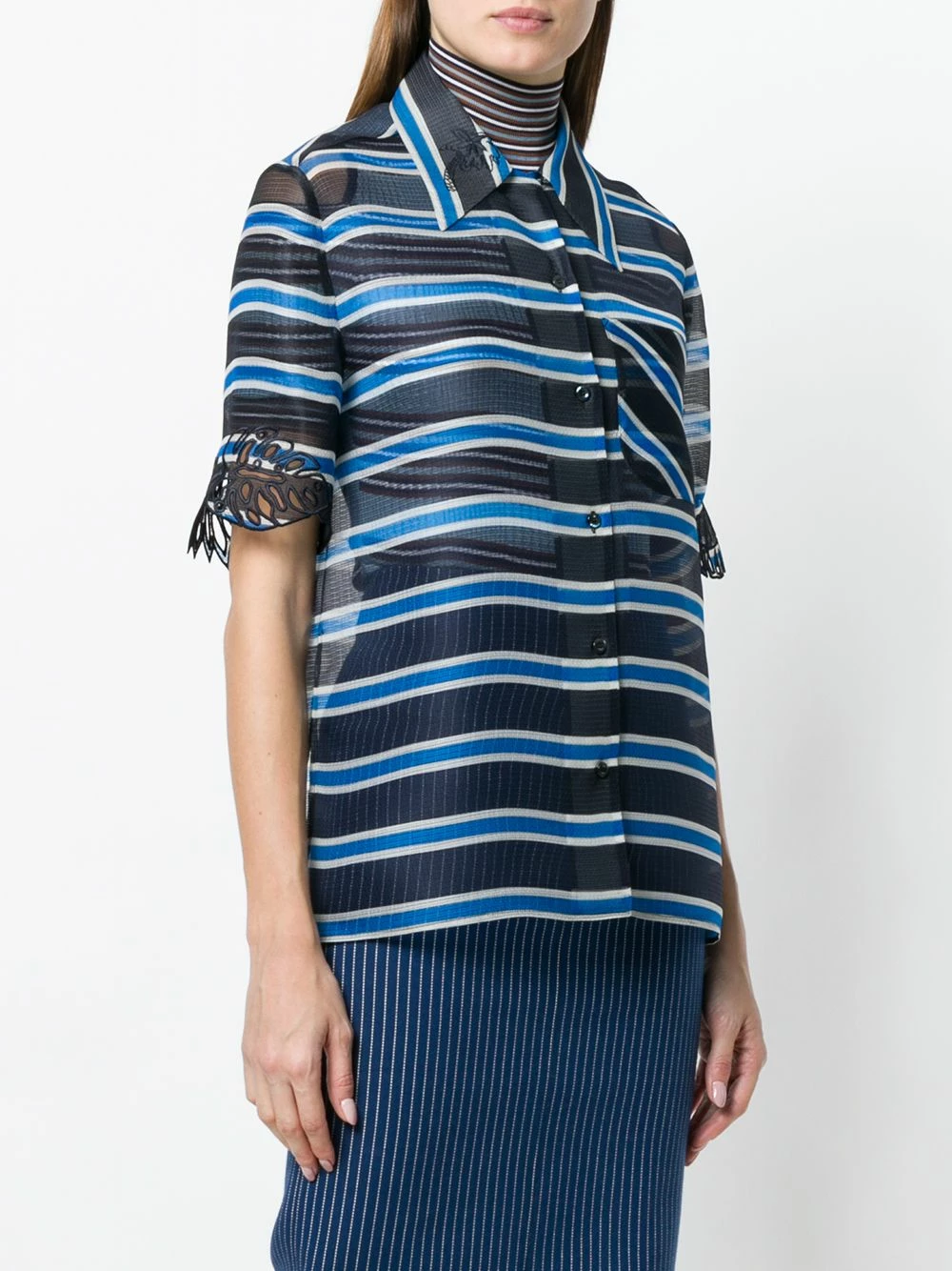 Established back in 1925, Italian fashion house Fendi never ceases to amaze the world with its style, elegance and impeccable sense of the ‘right now’. This blue, white and black silk striped sheer blouse is a staple piece and features a classic collar, a button fastening, short sleeves, a striped pattern, a sheer construction and a slim fit.