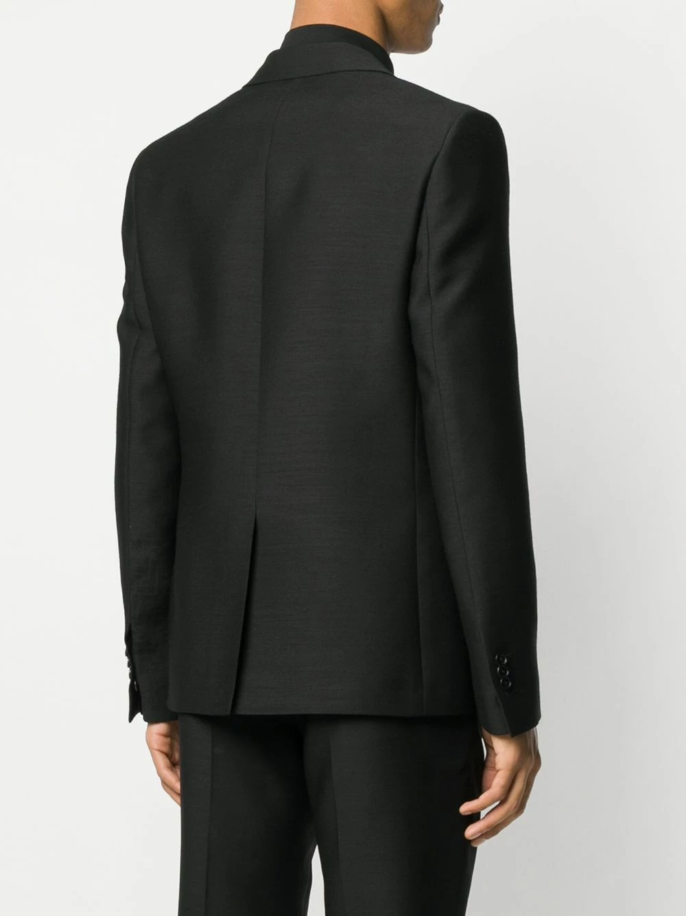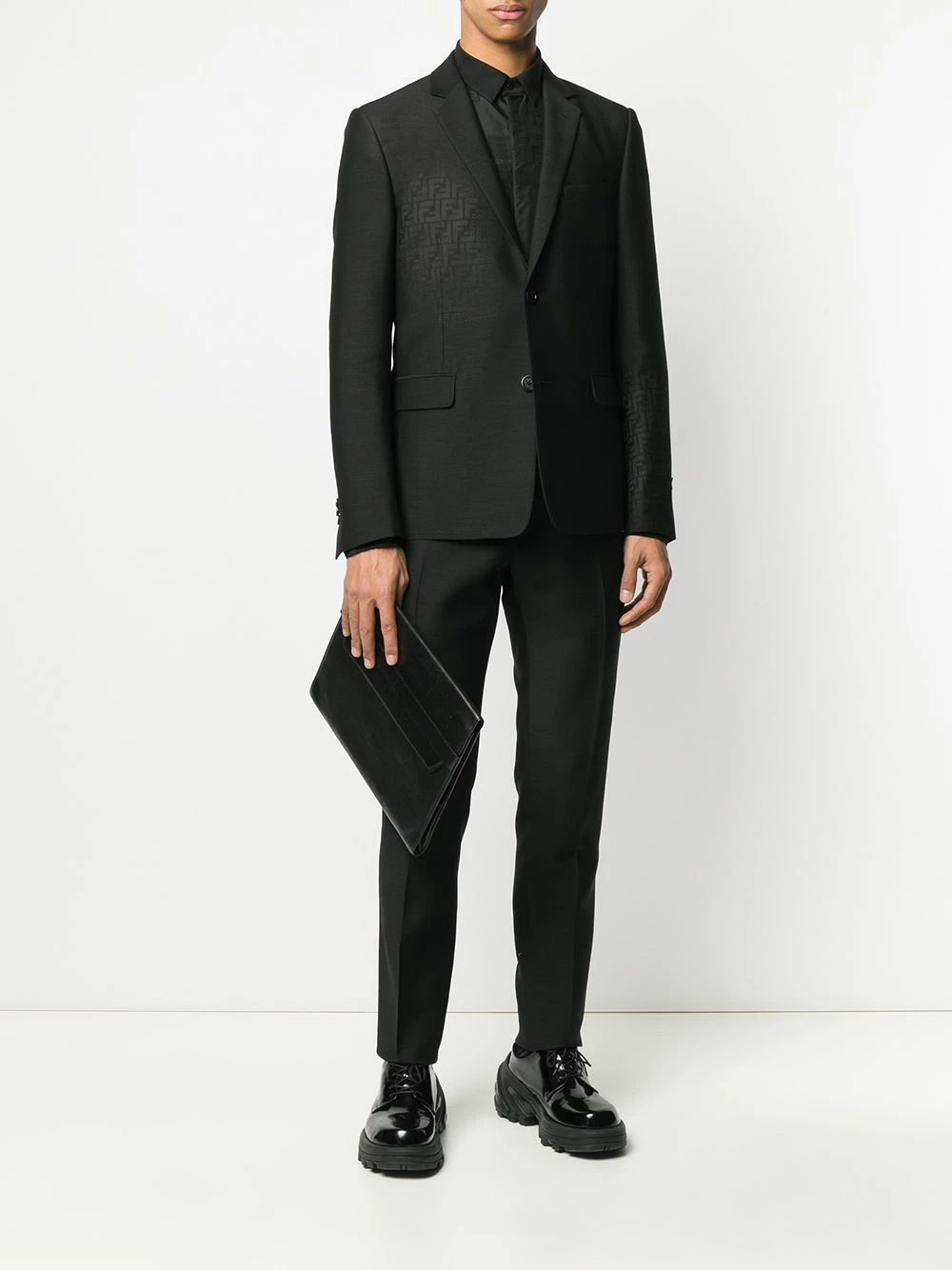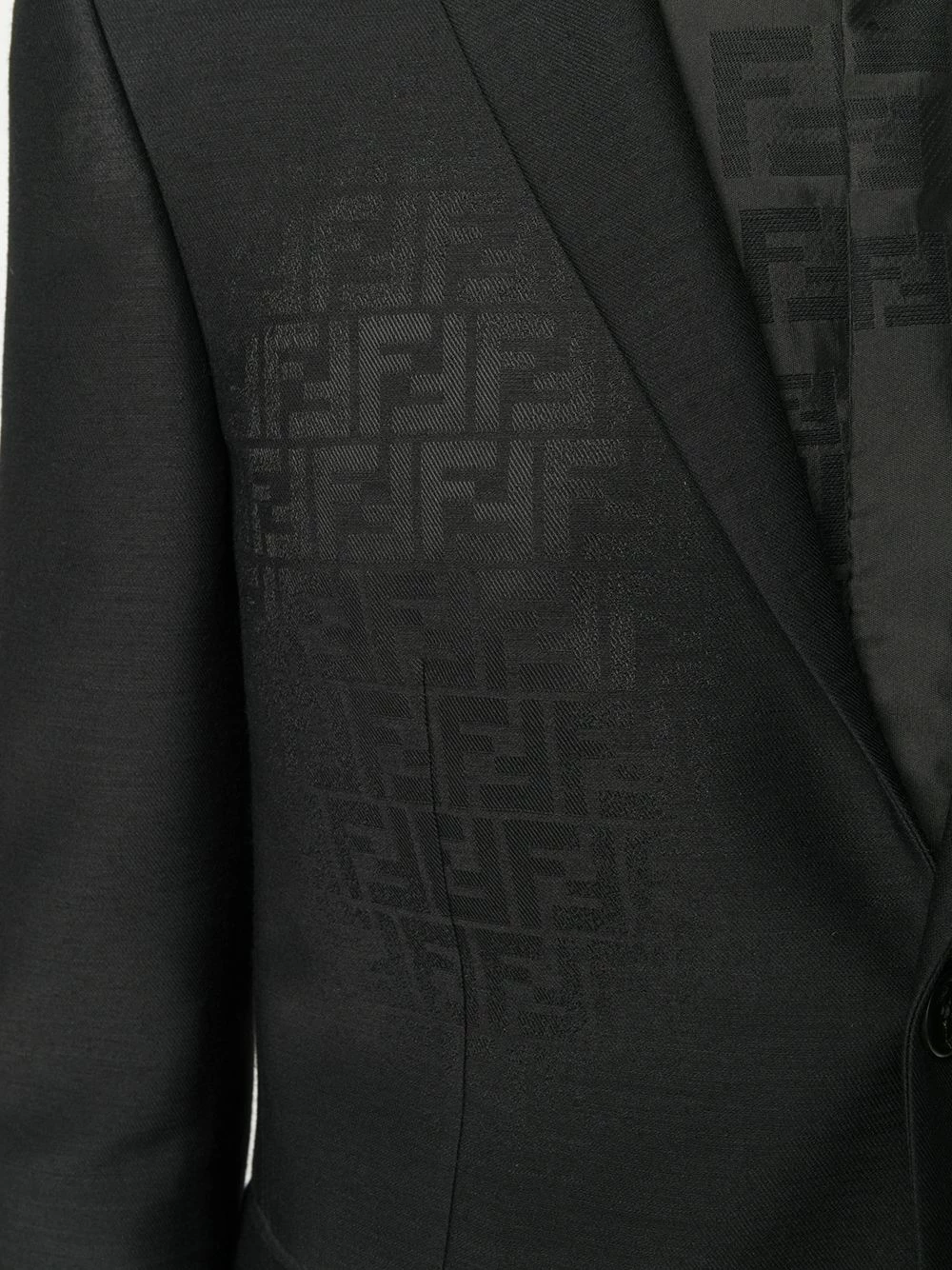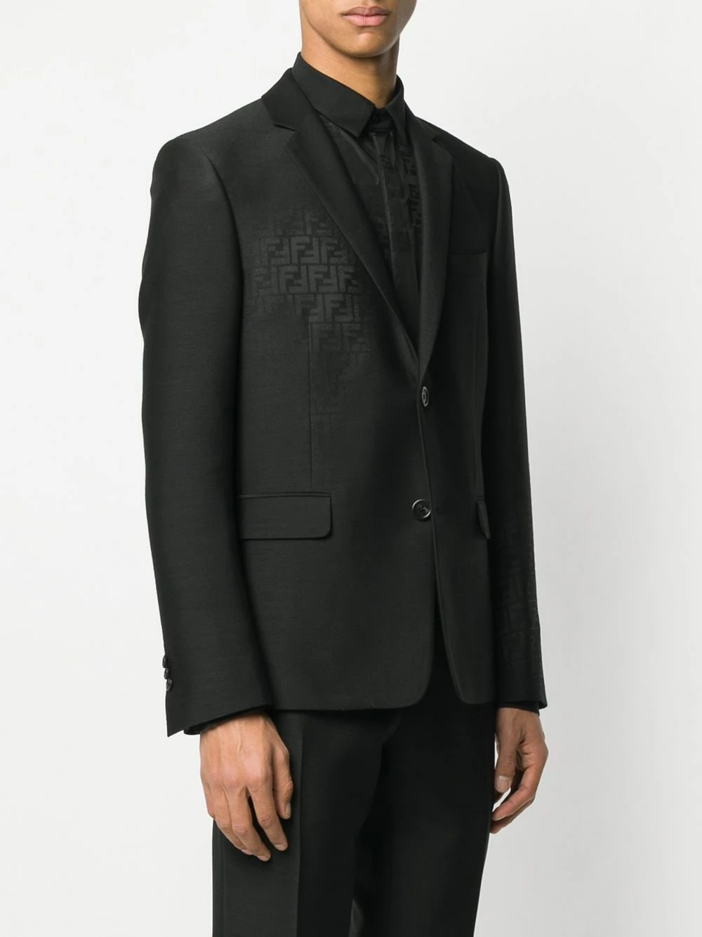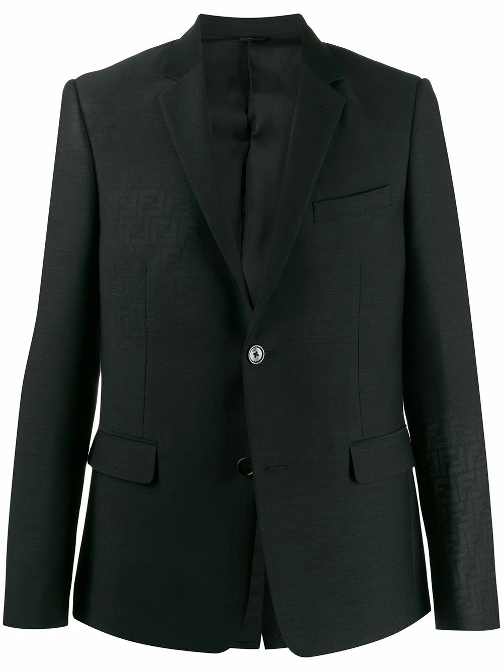 Walk into a room like you mean business and this FF motif blazer from Fendi can for sure help you with that. Spun from virgin wool and silk blend, this blazer boasts the iconic FF motif all over it, statement! Featuring notched lapels, a front button fastening, a chest pocket, long sleeves, front flap pockets and a rear central vent.