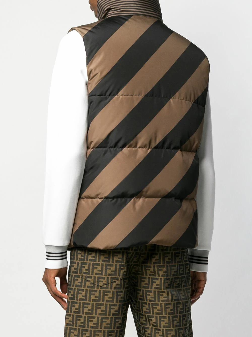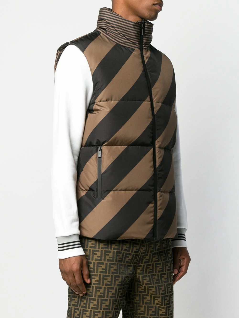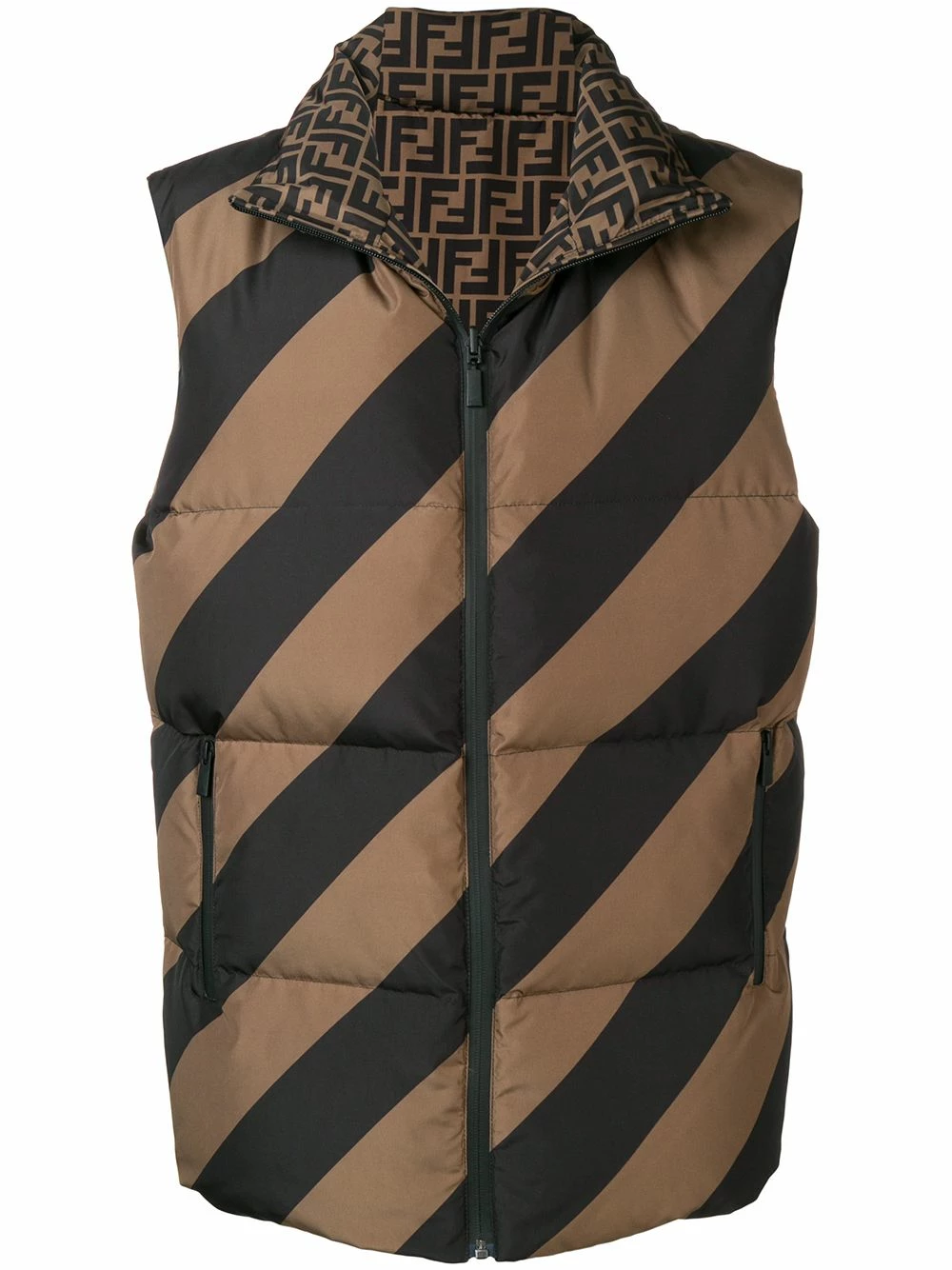 The FF logo plays a starring role in Fendiβs most recent collection. Available in various colours and fabrics, the brand has created a line that results in indulgent stunning garments. Crafted in Italy, this brown and black reversible quilted gilet from Fendi features a high standing collar, a front zip fastening, a sleeveless design, side zipped pockets and a short length.