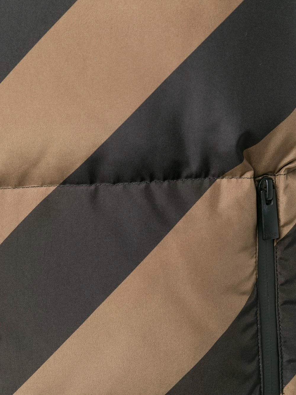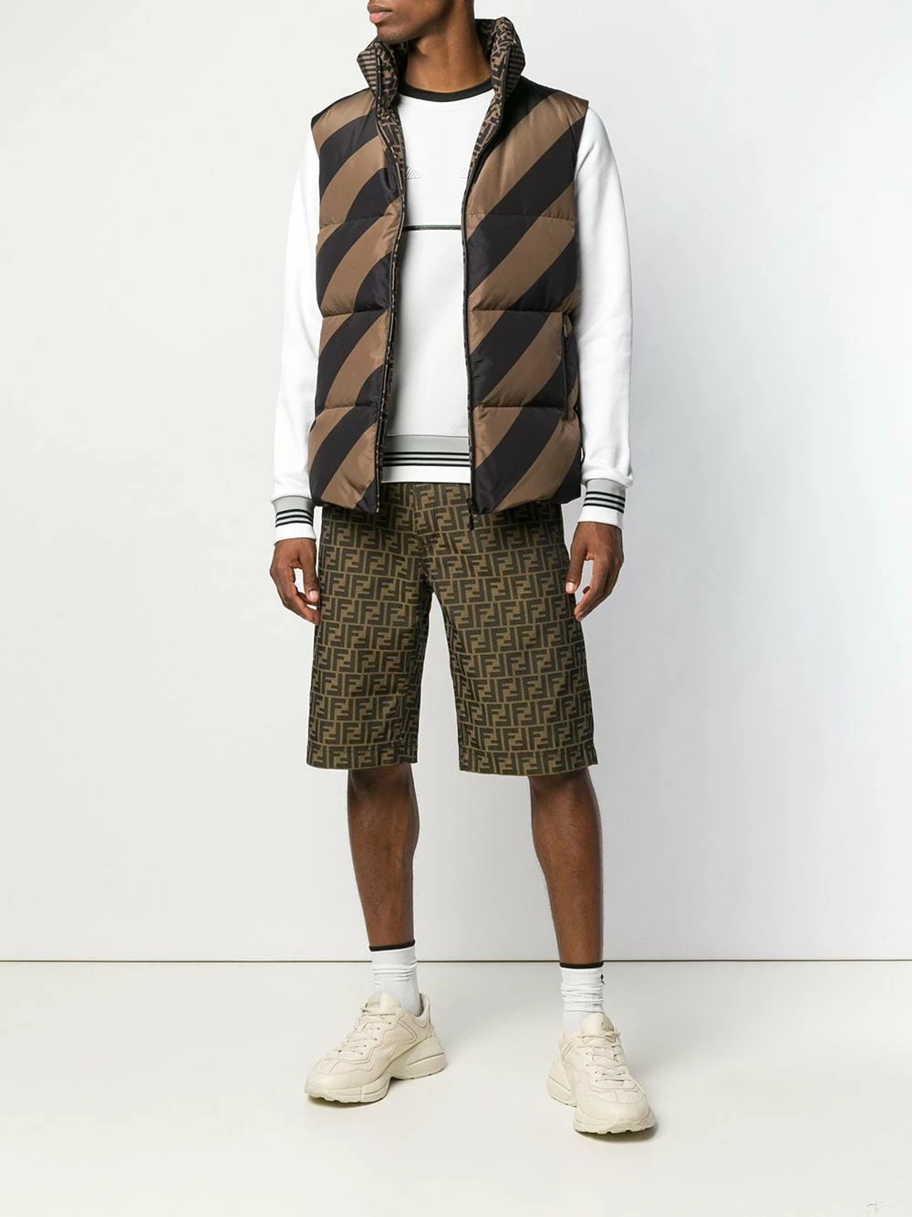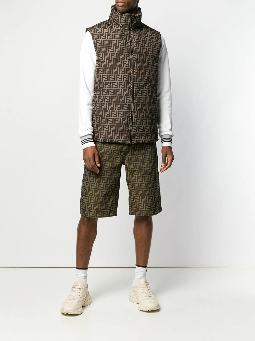 The FF logo plays a starring role in Fendiβs most recent collection. Available in various colours and fabrics, the brand has created a line that results in indulgent stunning garments. Crafted in Italy, this brown and black reversible quilted gilet from Fendi features a high standing collar, a front zip fastening, a sleeveless design, side zipped pockets and a short length.