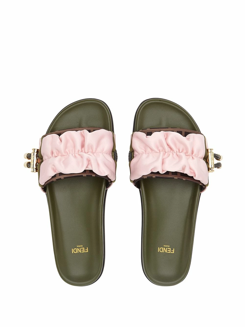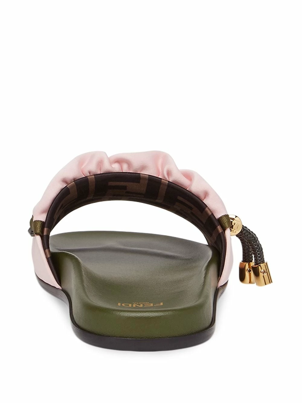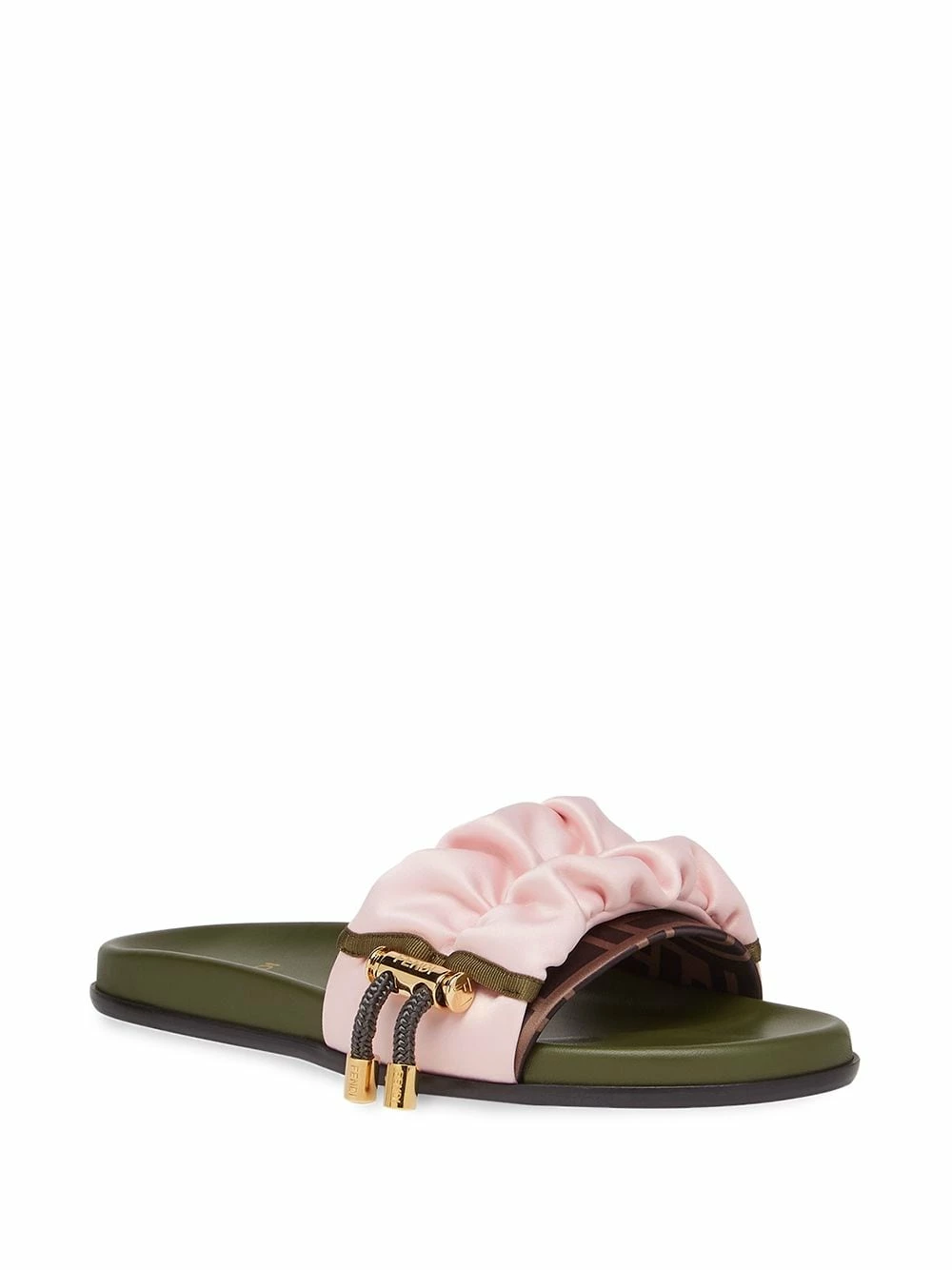 Step out in style. Fendi’s double band slides are designed in a peony pink and green hue with a drawstring logo stopper detail across the toe. Summer never looked so good.