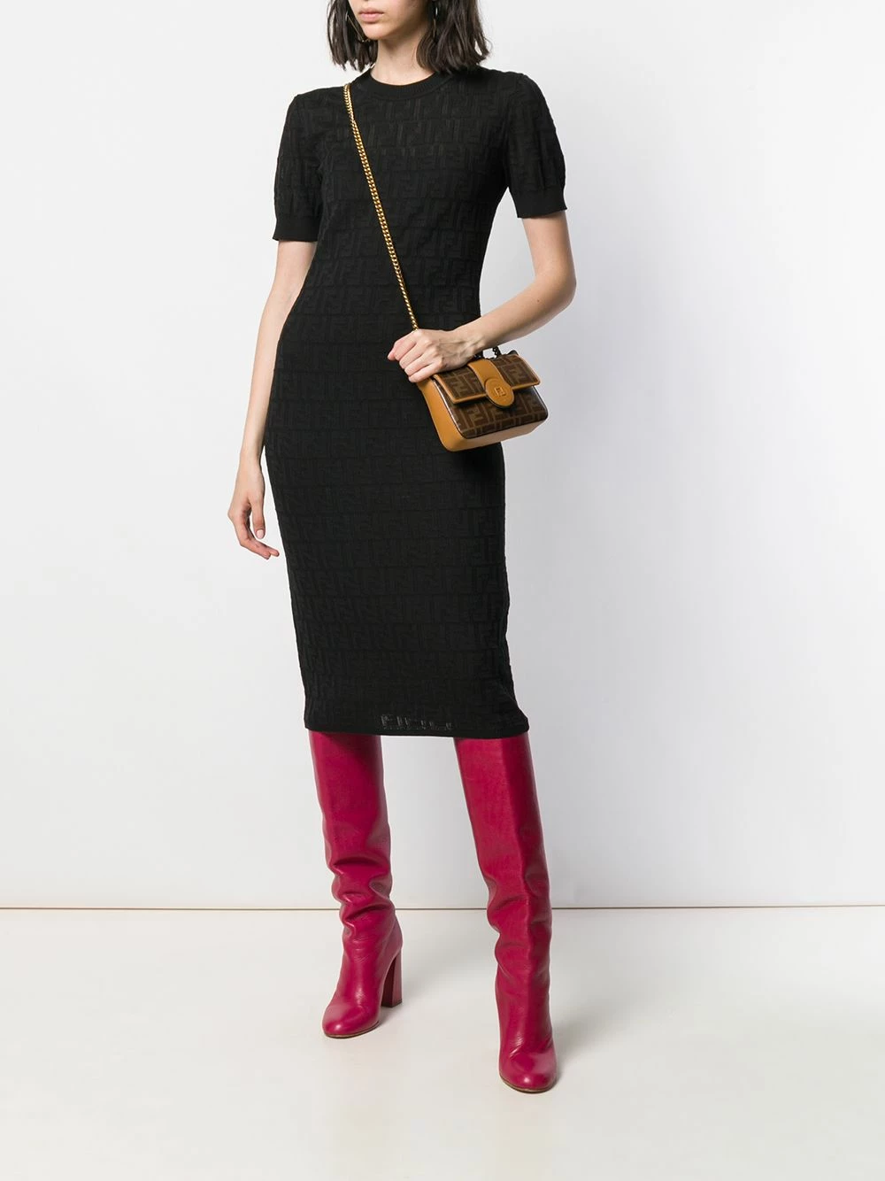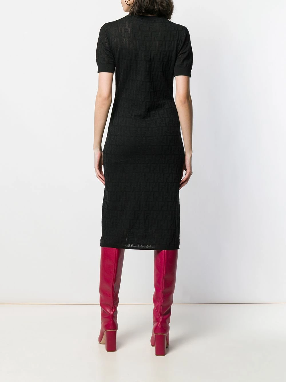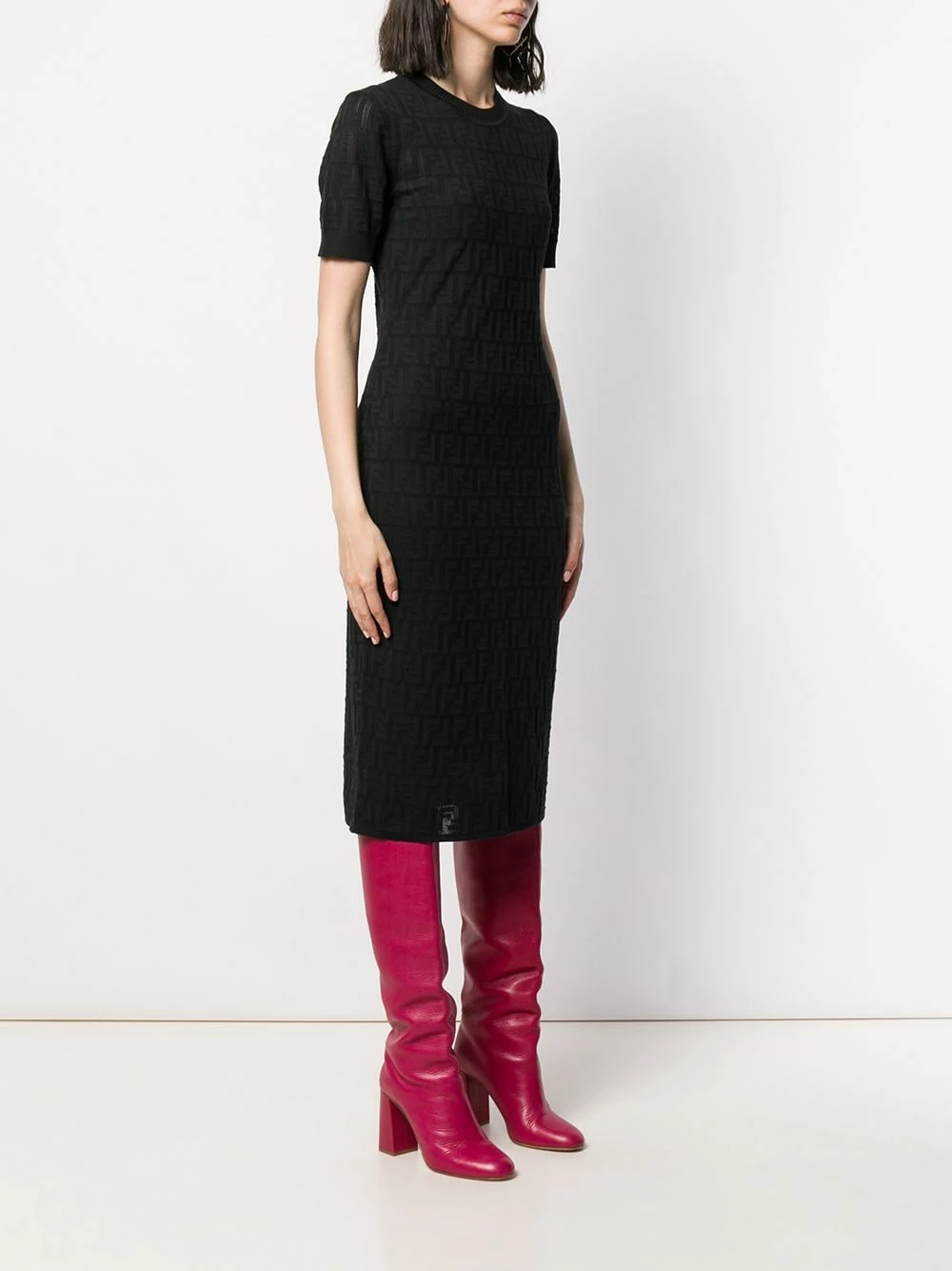 Fendi is all about sophisticated and trendsetting designs that showcase the brandβs contemporary and fashionable nature. By always offering immaculately crafted pieces with a modern twist, the brand has captured the hearts of the masses. This black cotton blend FF motif longette dress features a ribbed round neck, a fitted silhouette, a mid-calf length, a straight hem, short sleeves, and fitted cuffs.
