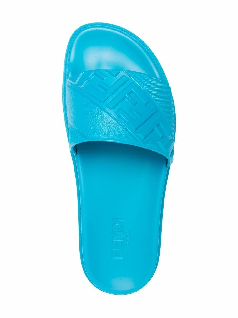 The Italian luxury fashion brand, Fendi, is known for its timeless styles and high-quality materials. A fine example are these blue rubber slides, constructed with a flexible polyurethane footbed and decorated with an embossed FF diagonal motif and intarsia stripes.