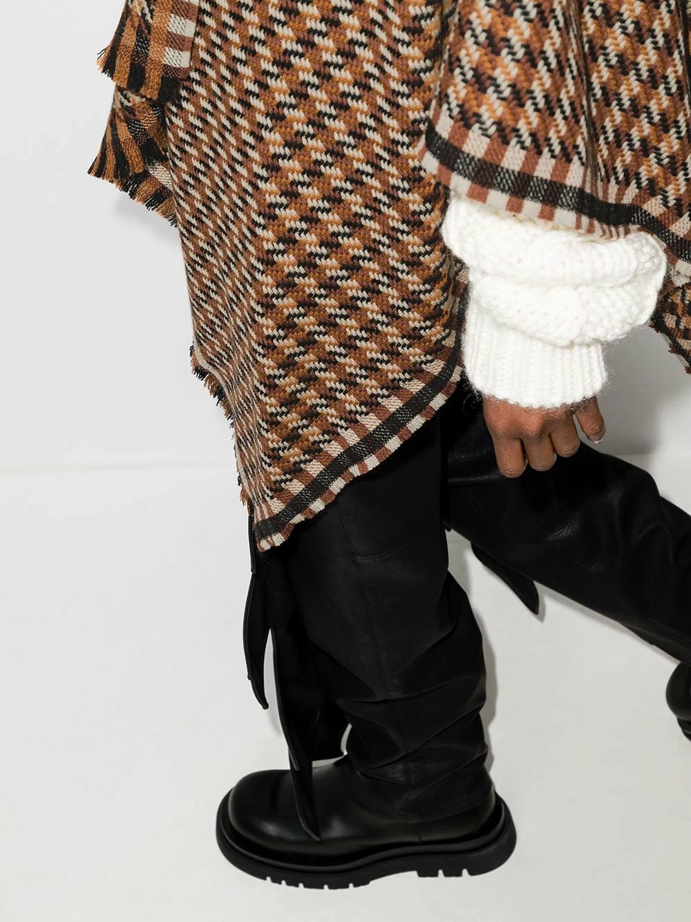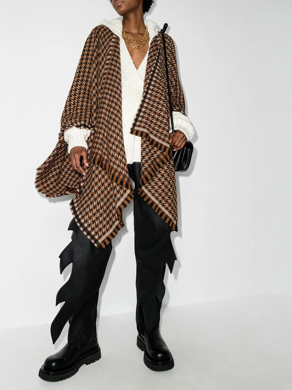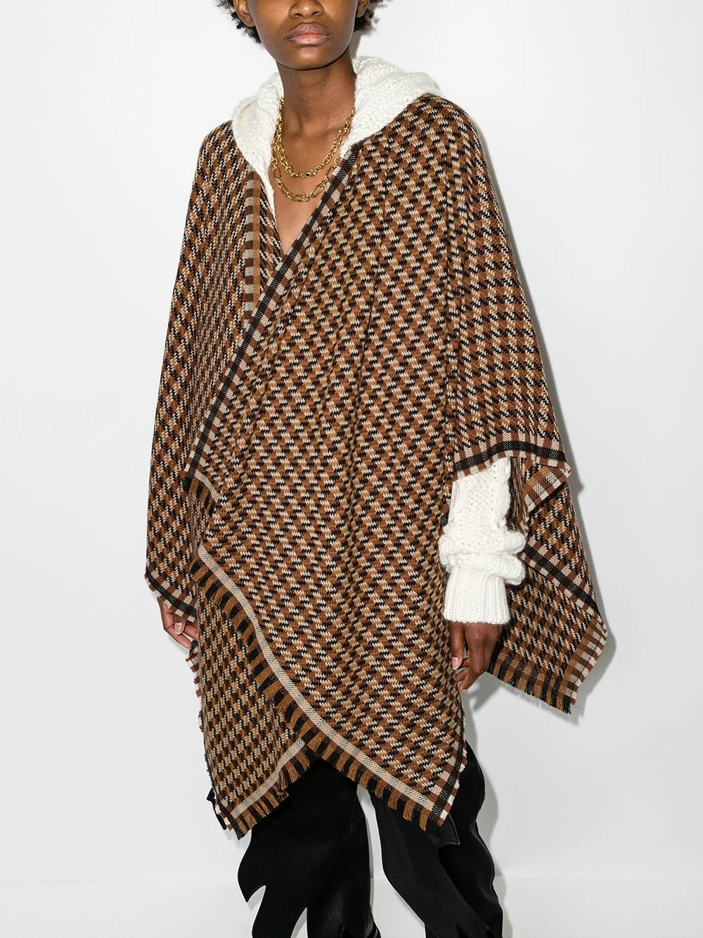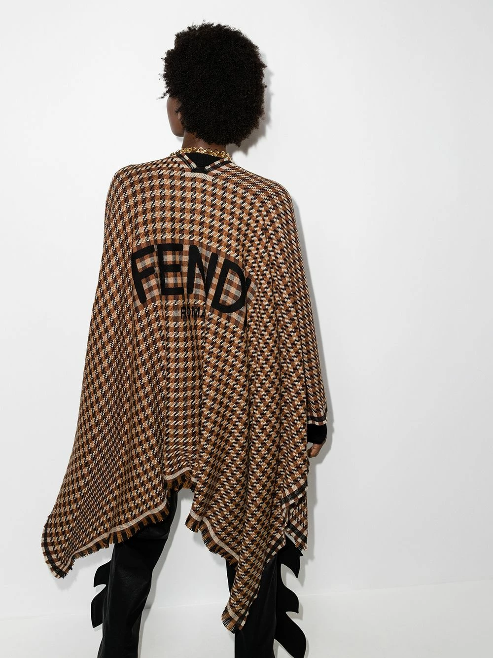 Known for its use of bold logo detailing, Fendi presents this check wool poncho. Its distinctinve branding is pronounced with a black logo to the back.