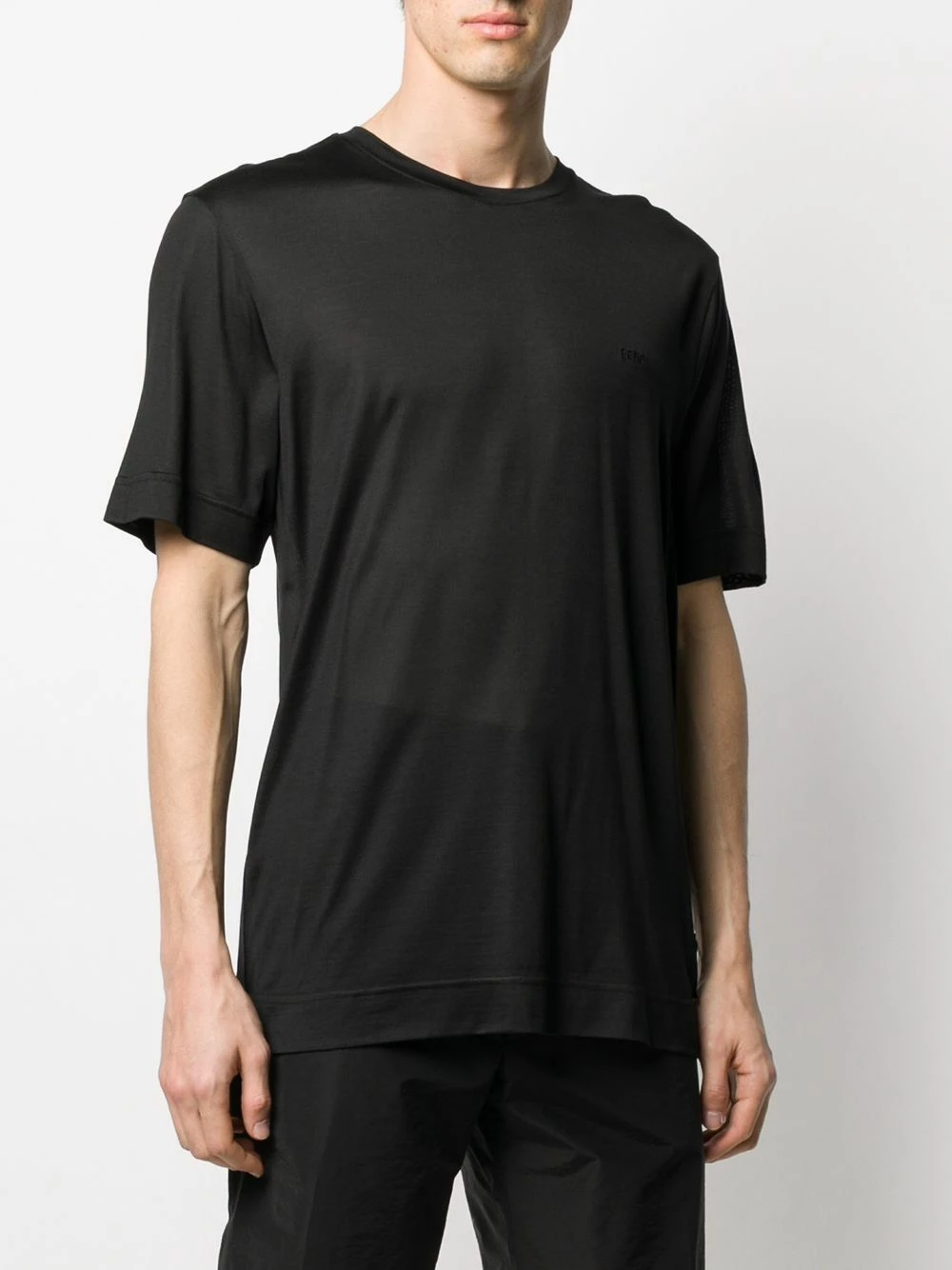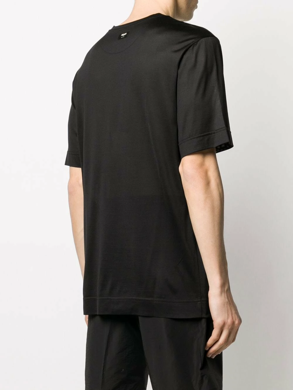 Simplicity is key. Crafted from silk, this black T-shirt from Fendi is detailed with a tonal embroidered designer logo to the chest and a tonal logo patch to the rear. The perfect choice for a smart casual look. Featuring a crew neck, short sleeves and a straight hem.