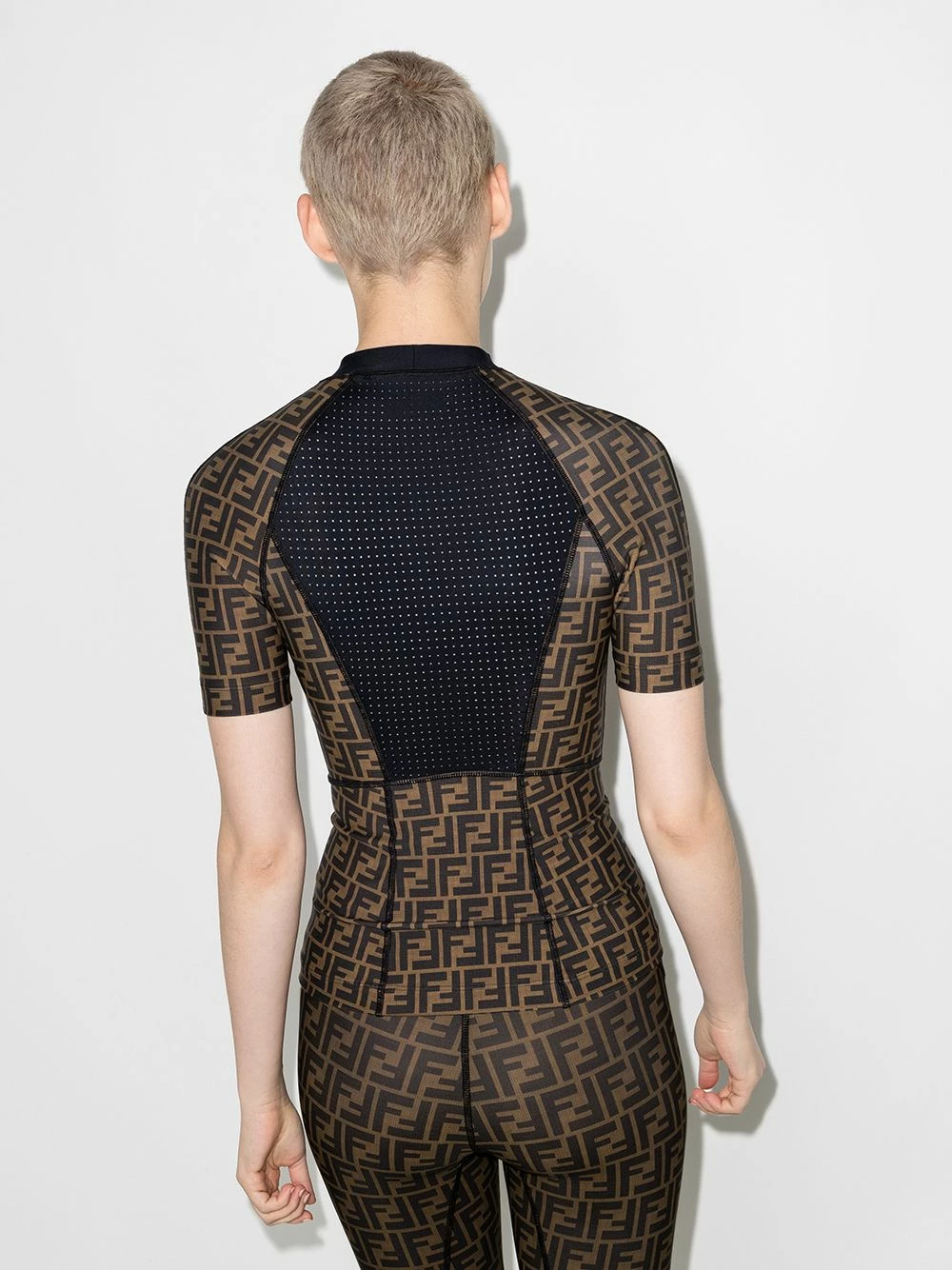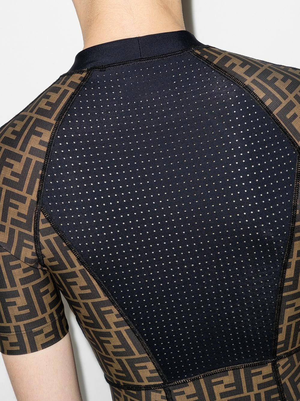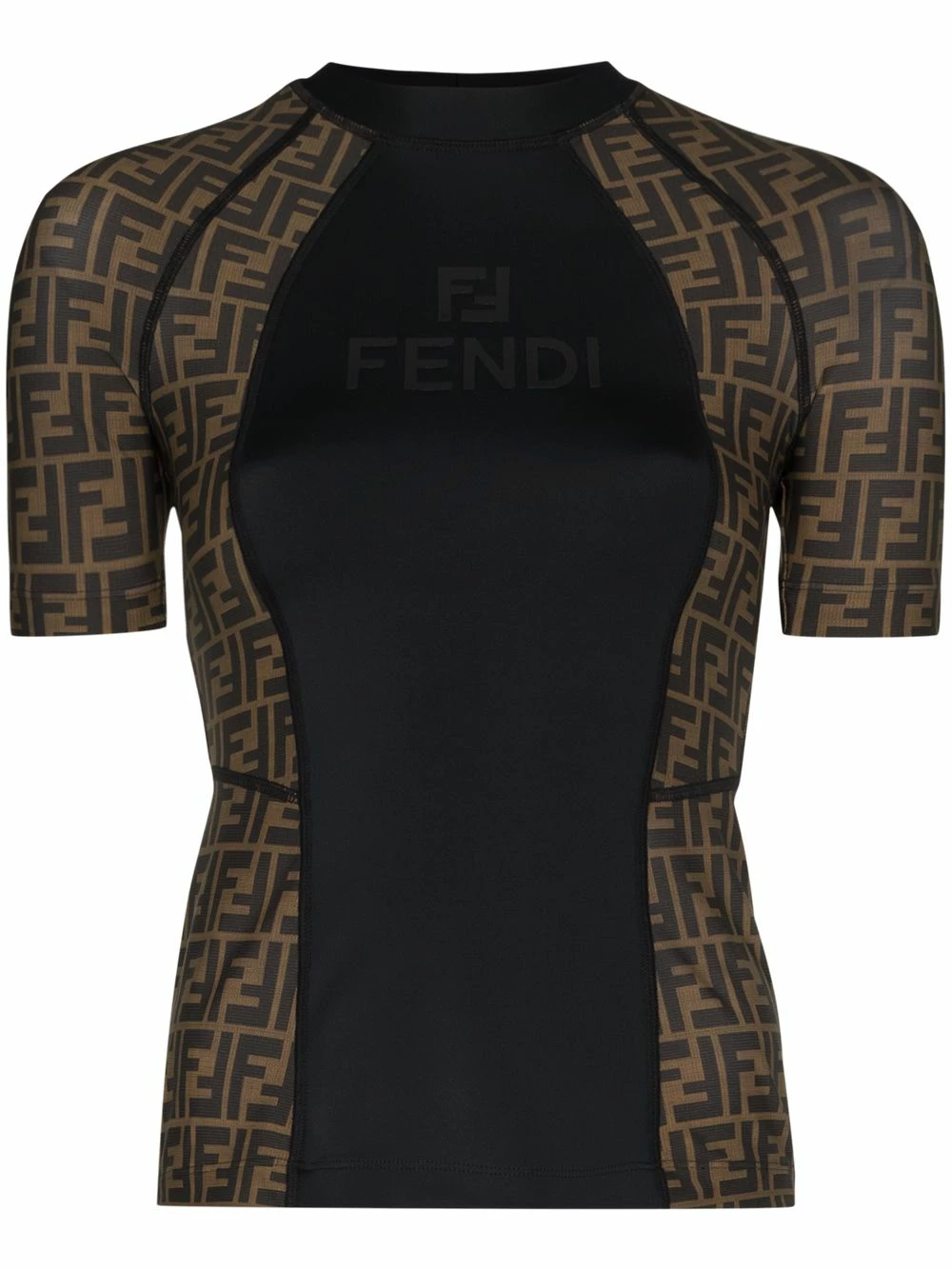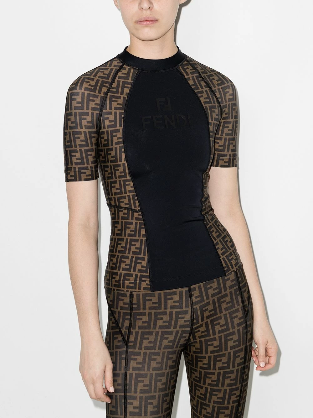 The iconic FF motif appears in the house’s signature brown and black colourway on this panelled Fendi T-shirt. First seen in 1965, the logo still feels contemporary today.