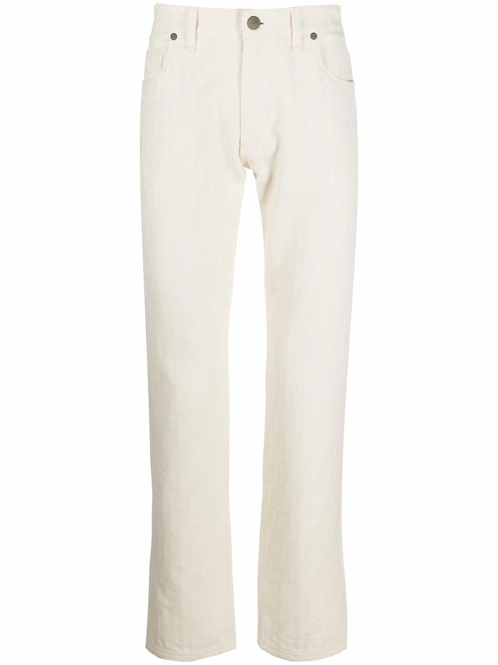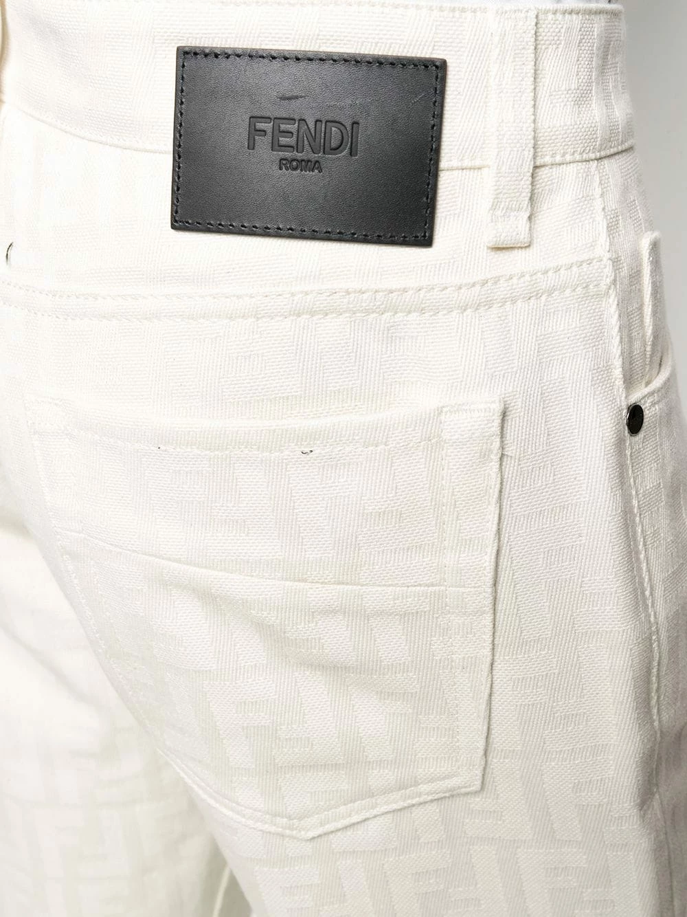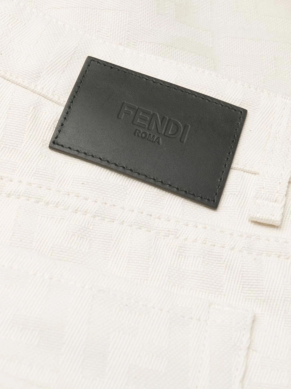 Take a second look. Upon closer inspection, you’ll spot a subtle Fendi motif print covering these trousers. Go for the unexpected! Featuring belt loops, a button and zip fly, side slit pockets, two back patch pockets, a monogram pattern and a straight leg.