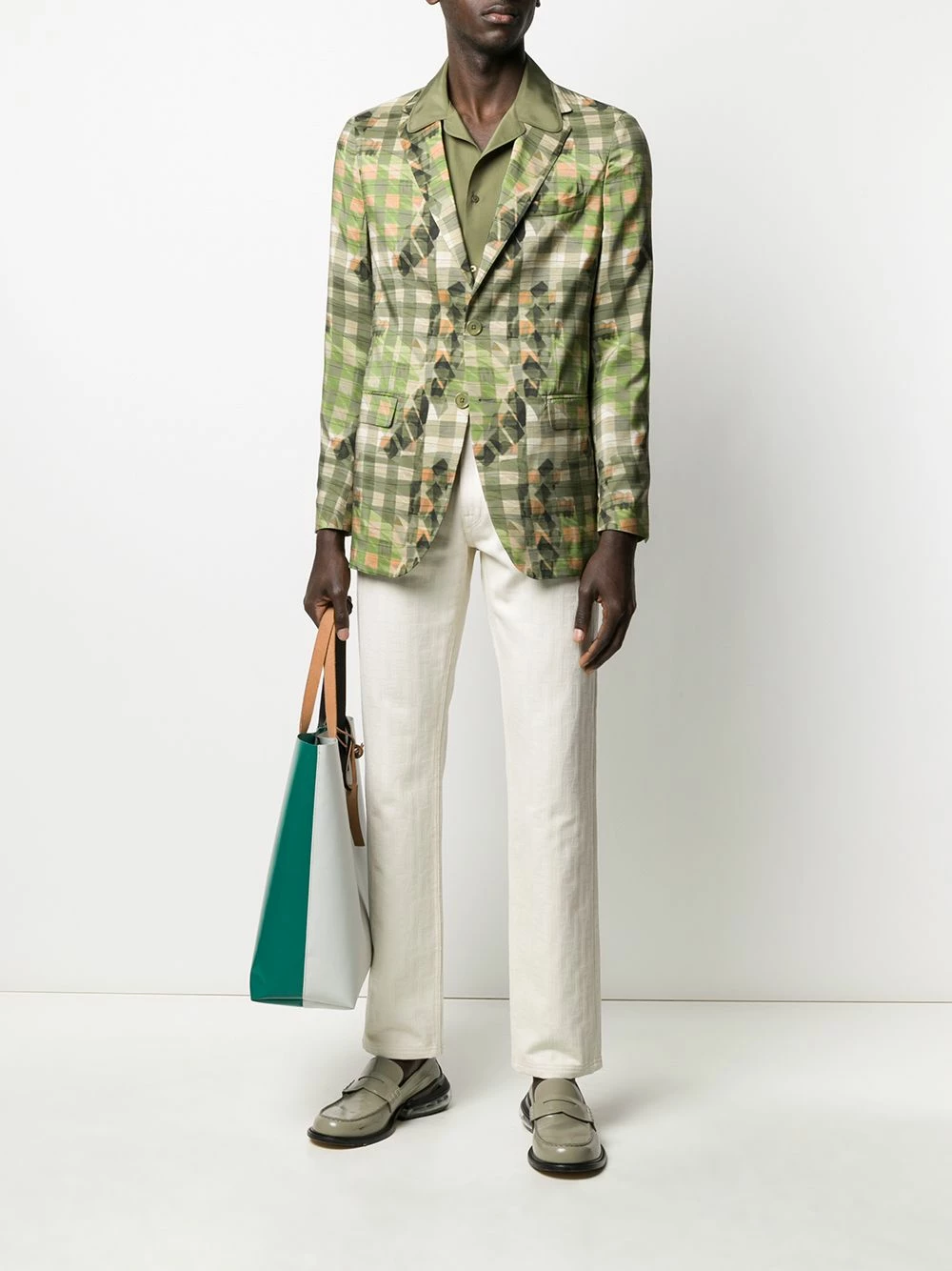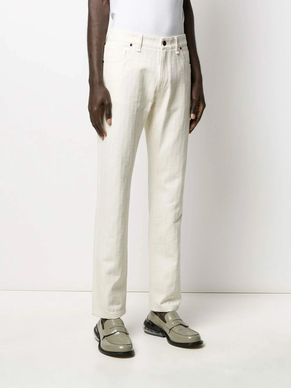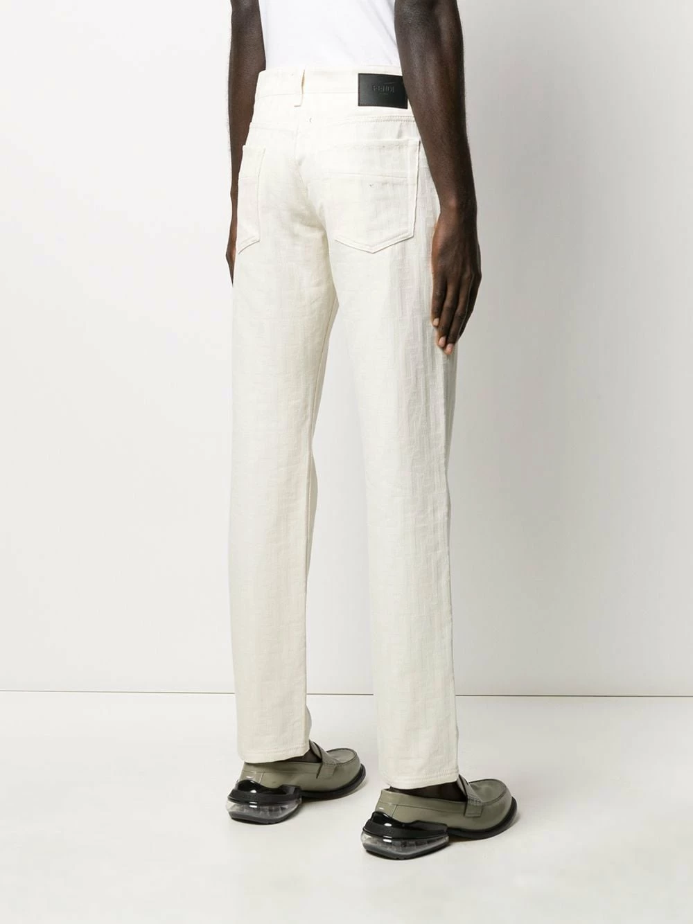 Take a second look. Upon closer inspection, you’ll spot a subtle Fendi motif print covering these trousers. Go for the unexpected! Featuring belt loops, a button and zip fly, side slit pockets, two back patch pockets, a monogram pattern and a straight leg.