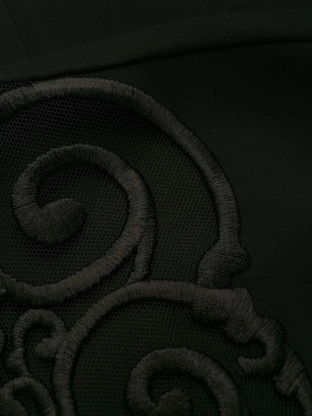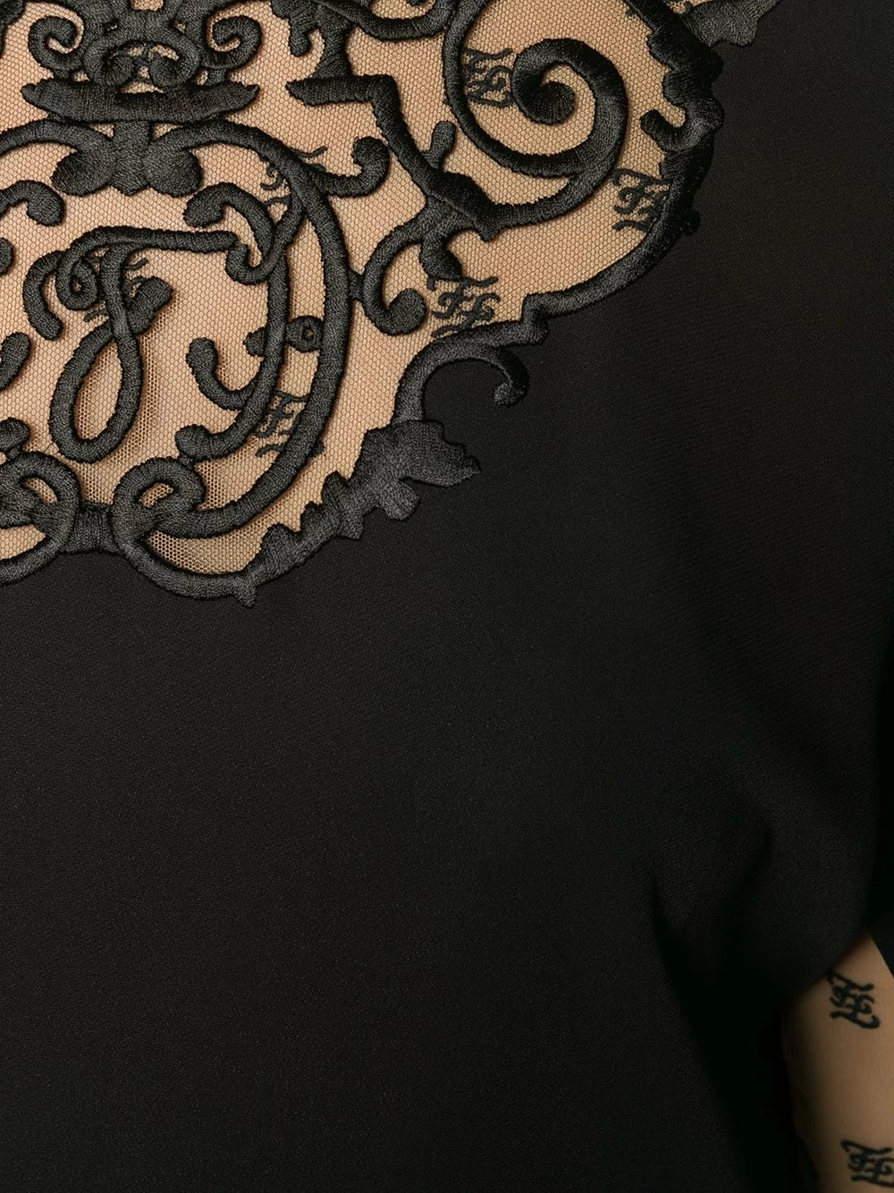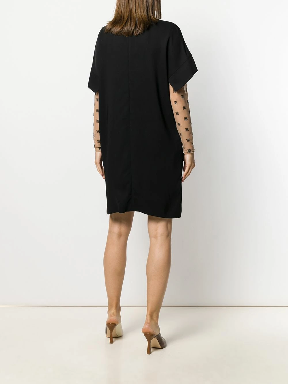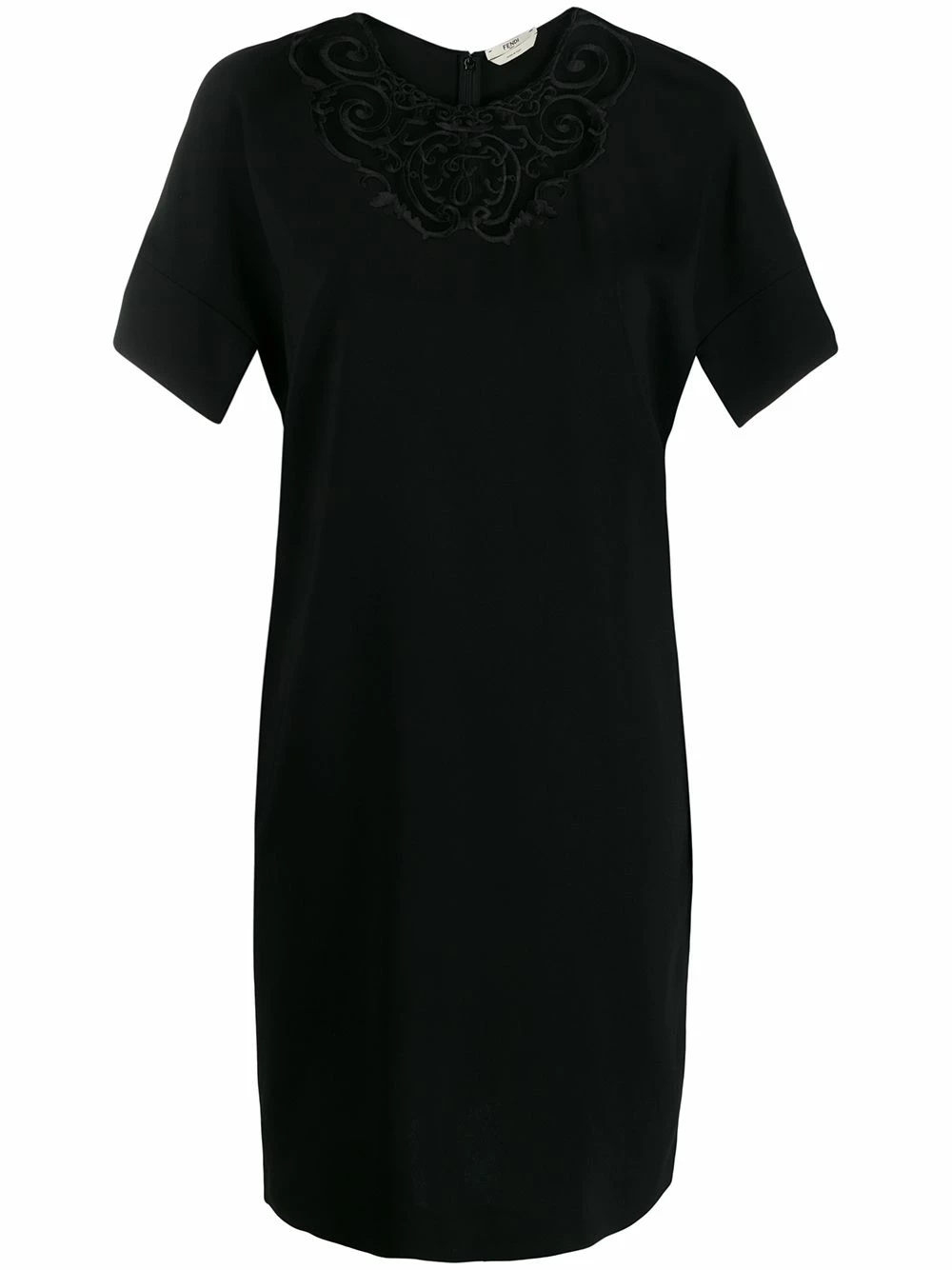 Forget the LBD. Everyone should own an ESD: an embroidered shift dress from Fendi. Say hello to your latest wardrobe essential. Featuring an embroidered design, a sheer panel, a round neck, short sleeves, a shift silhouette and a mid-length.