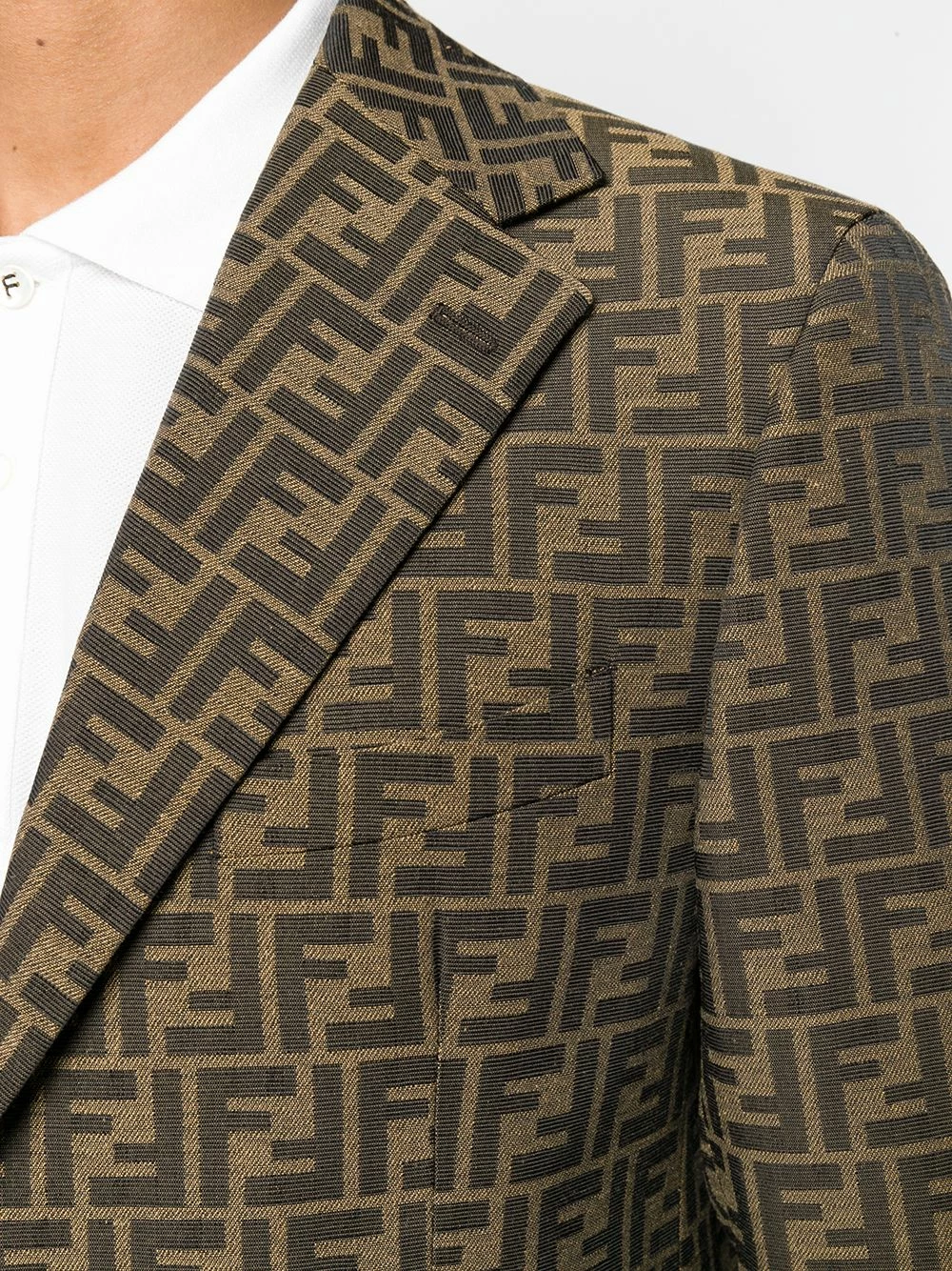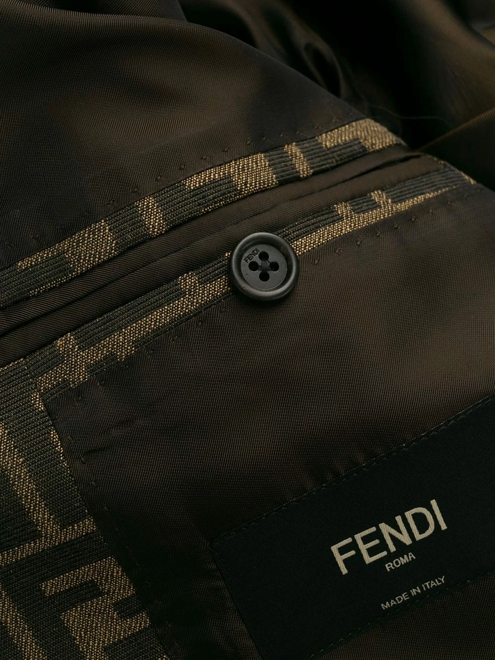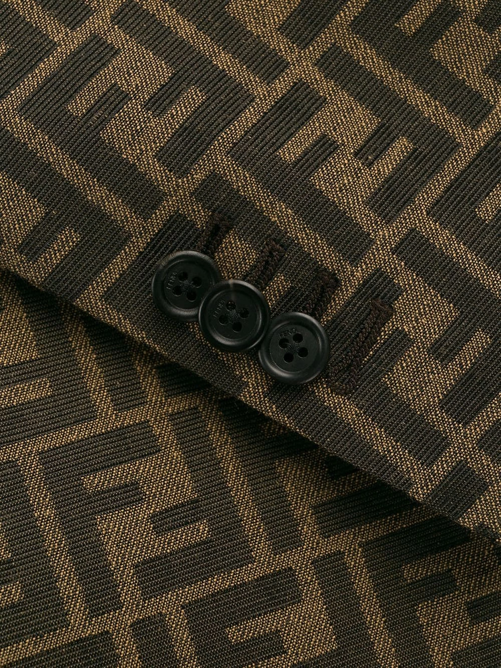 Italian fashion powerhouse Fendi is all about style and glamour with a twist. For the new season expect to see plenty of double-F logos, stylish suits and the statement pieces, like this brown cotton blend FF all over logo print blazer. Featuring a wide lapel, a back slit at hem, a jacquard effect, two front pockets, an internal concealed pocket, a two-button fastening and inside labelled tag.