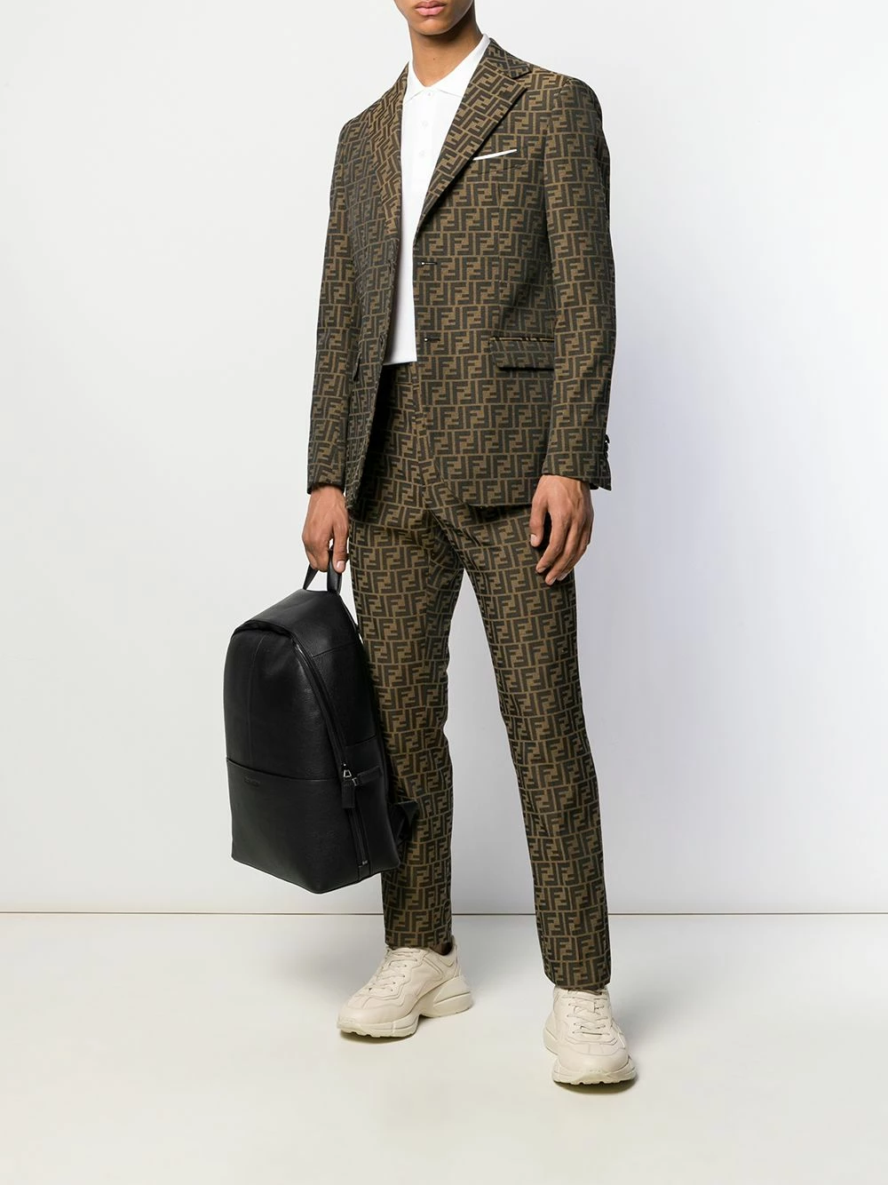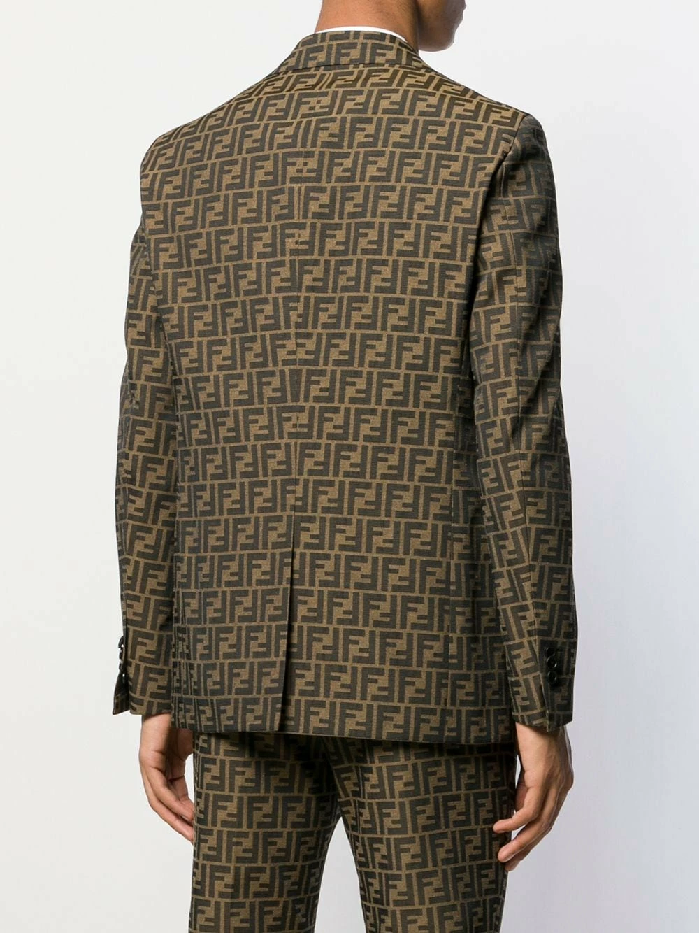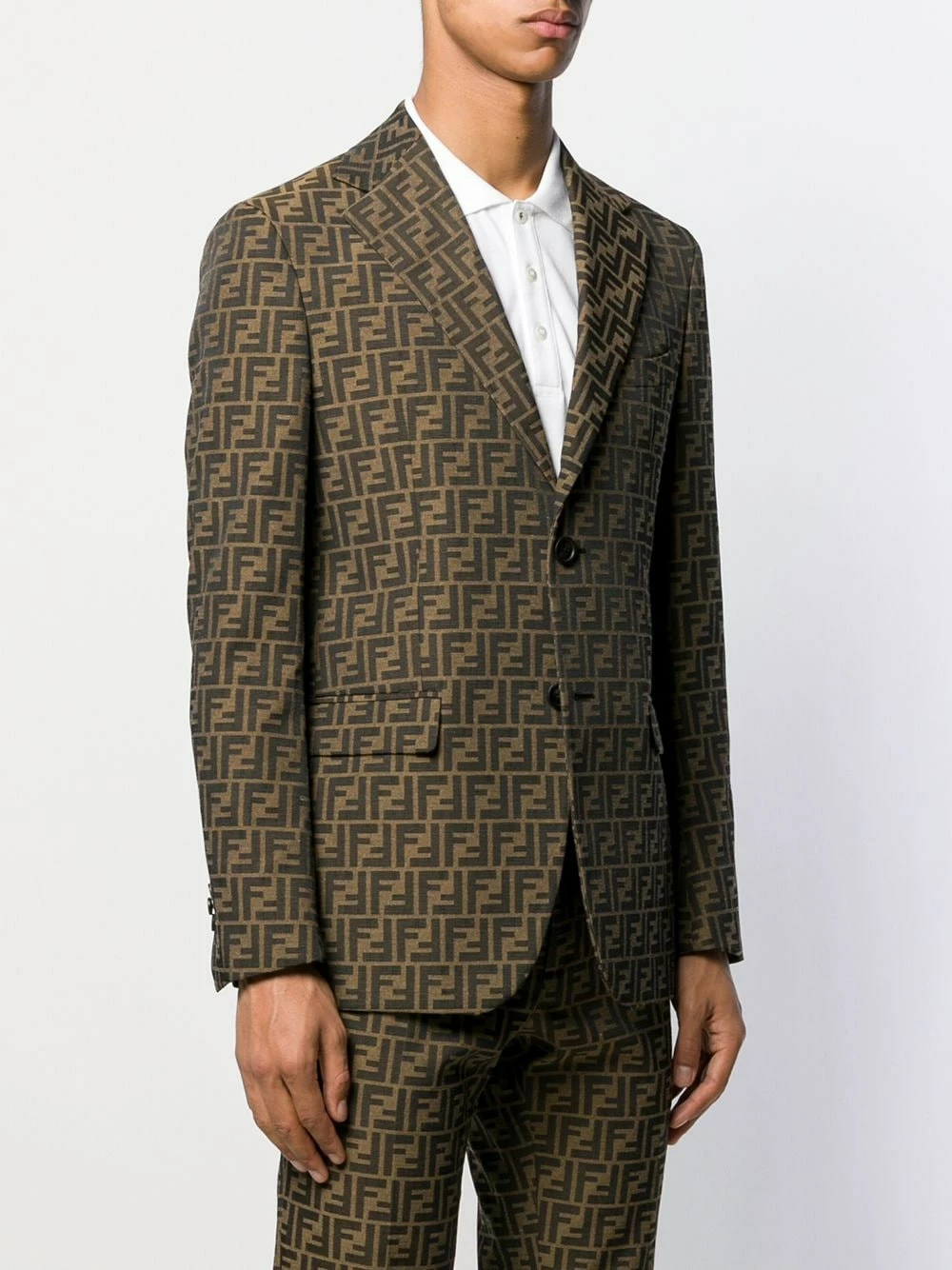 Italian fashion powerhouse Fendi is all about style and glamour with a twist. For the new season expect to see plenty of double-F logos, stylish suits and the statement pieces, like this brown cotton blend FF all over logo print blazer. Featuring a wide lapel, a back slit at hem, a jacquard effect, two front pockets, an internal concealed pocket, a two-button fastening and inside labelled tag.