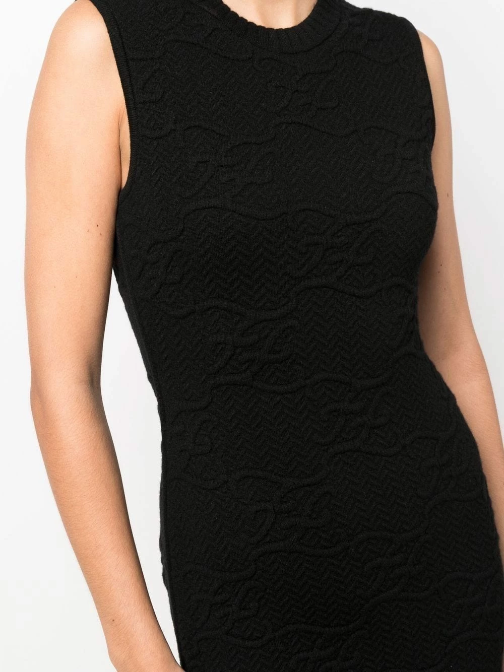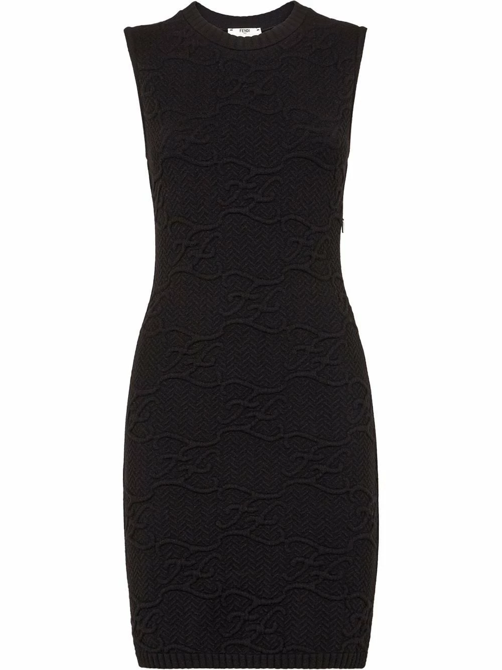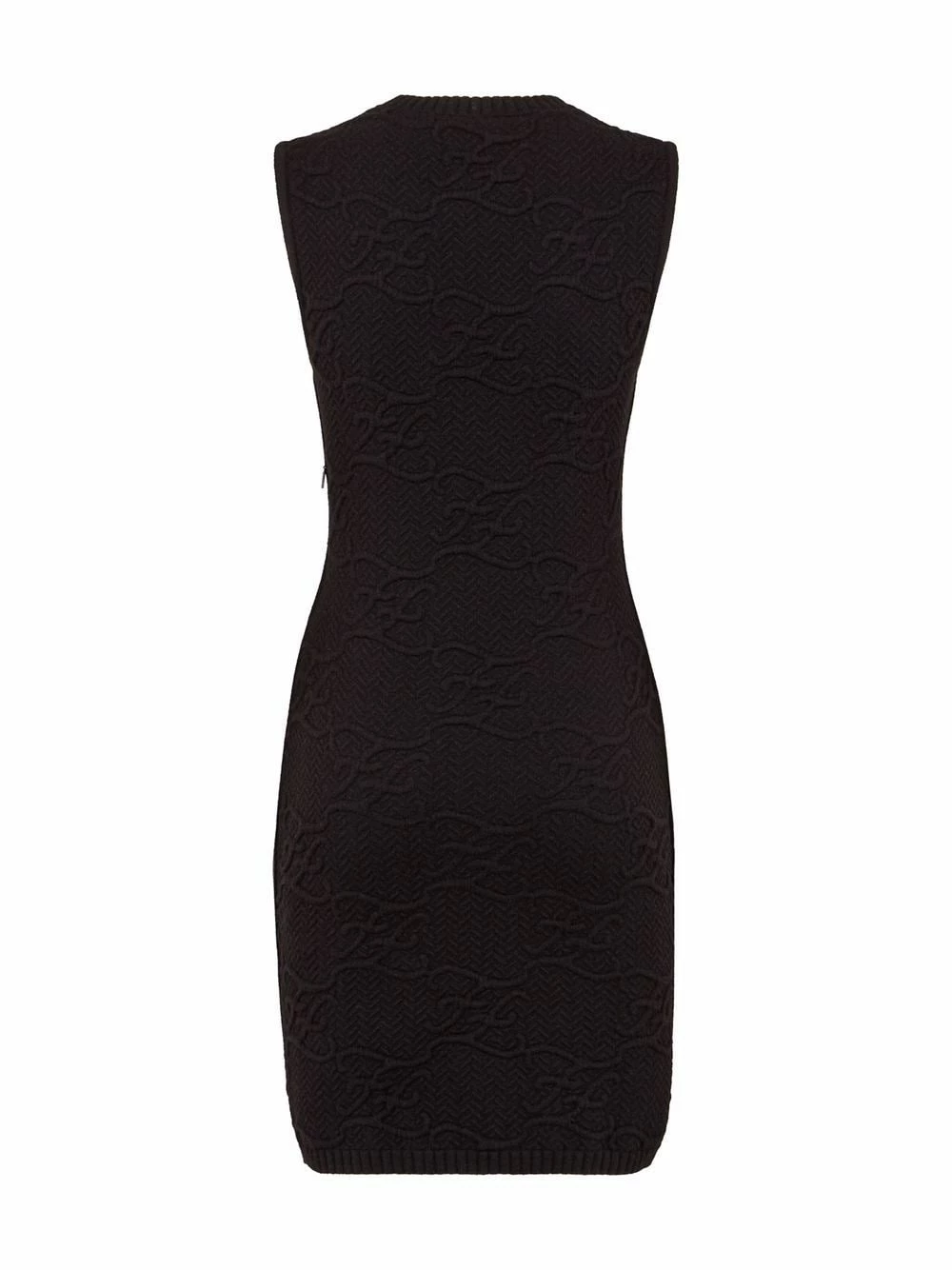 A black hue creates a refined look for this sleeveless Fendi dress. The tonal design of the FF Karligraphy motif adds iconic branding without distracting from the piece’s elegant style.