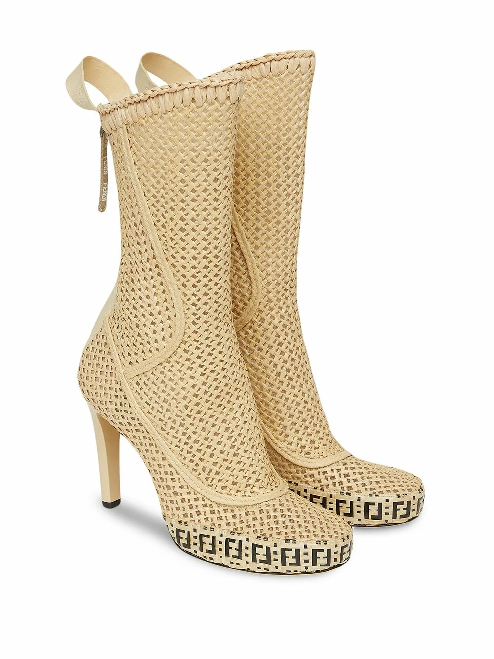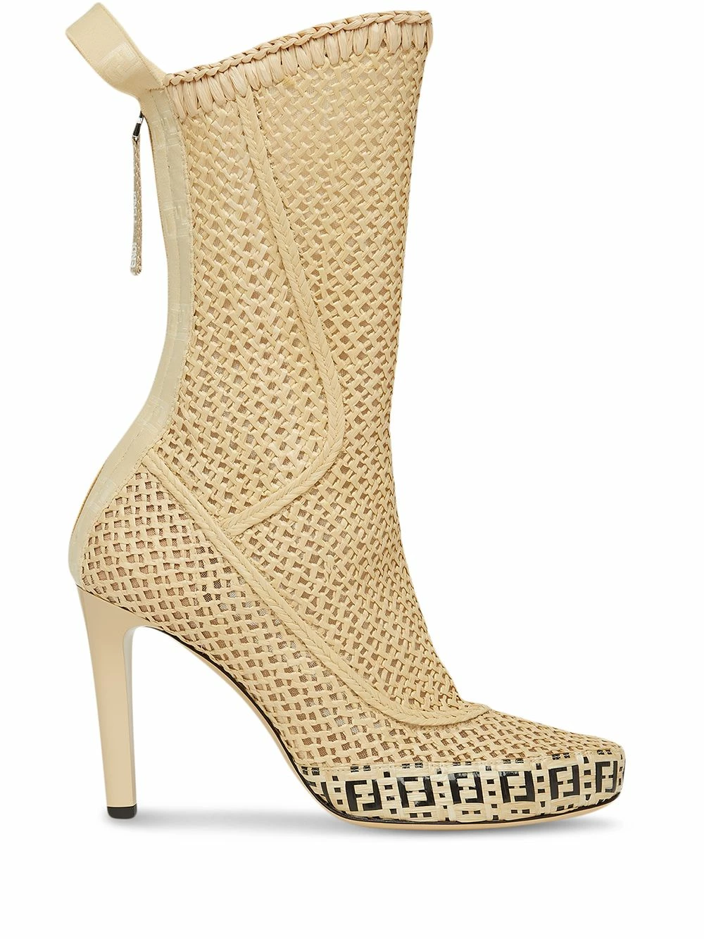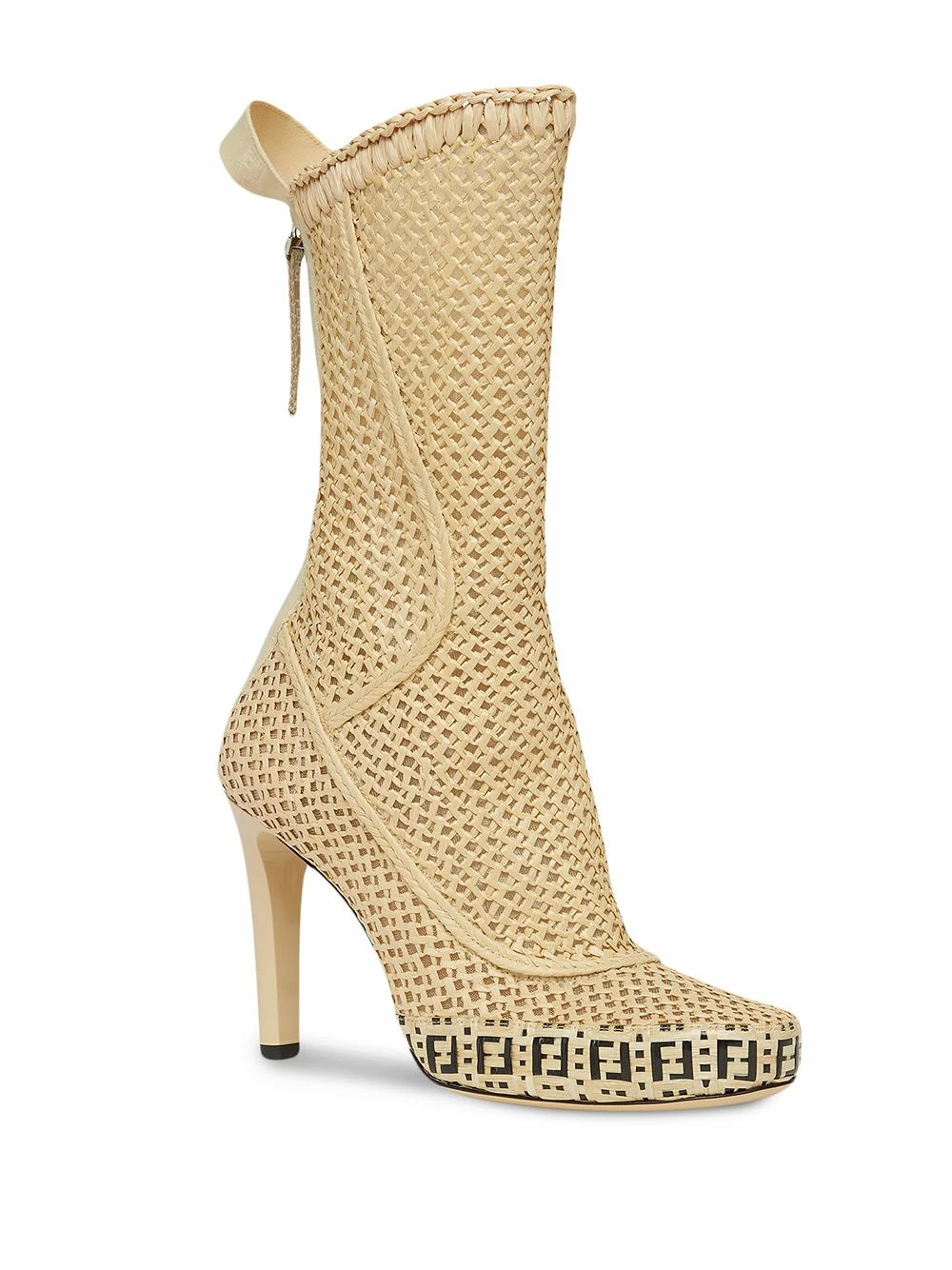 Your style credentials are set to climb with these Fendi boots. With a woven raffia design, this pair is set atop a high heel thatβll take your looks up a notch. Up, up and away.