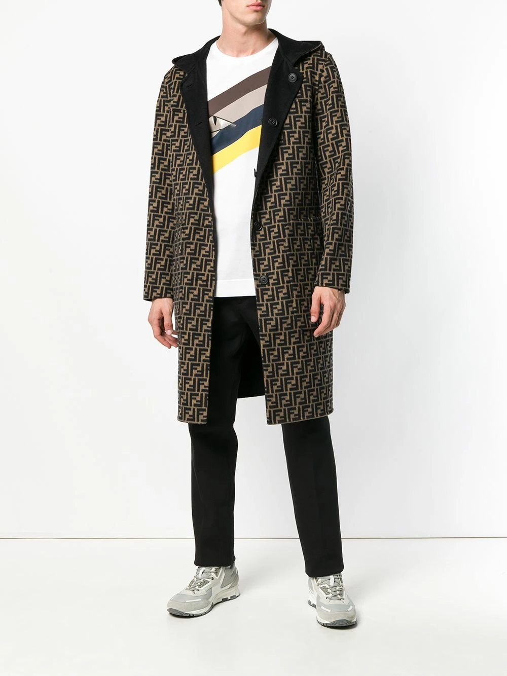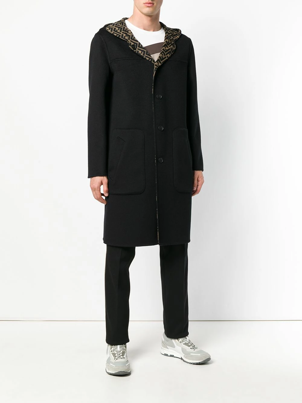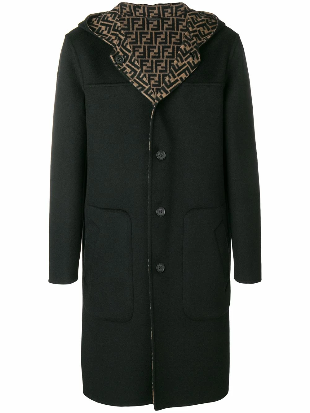 Feel comfortable and elegant with Fendiβs newest menswear collection. From cosy embroidered knitwear to fashionable printed shirts, the brandβs latest collection offers comfortable elegance for the modern men. This black virgin wool-silk blend hooded midi coat from Fendi features a front button fastening, long sleeves, two front pockets and a light brown lining with black FF logos.