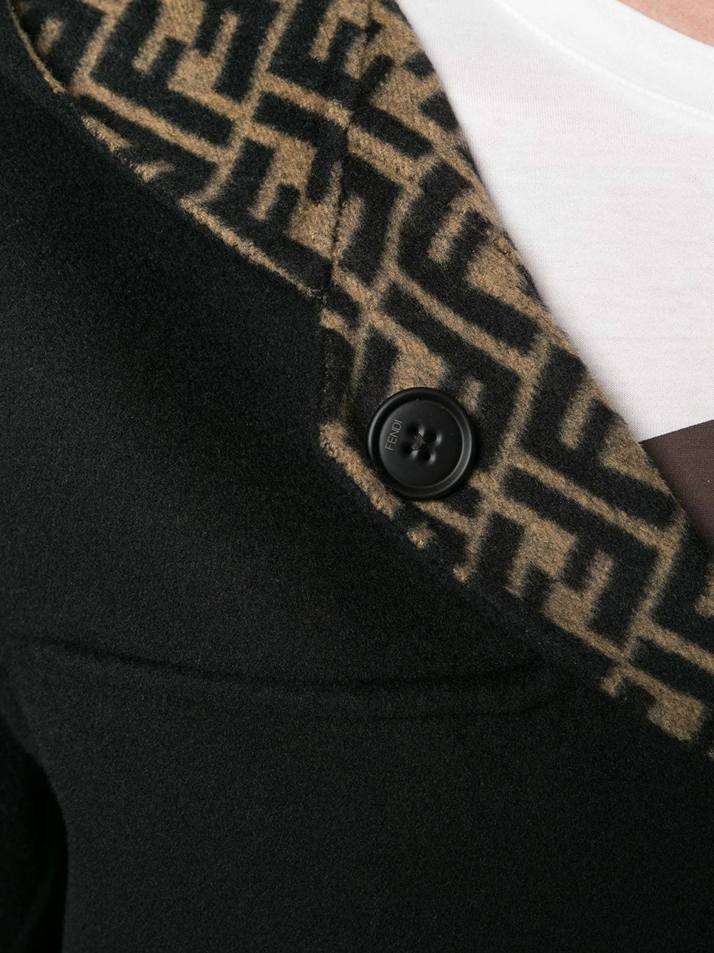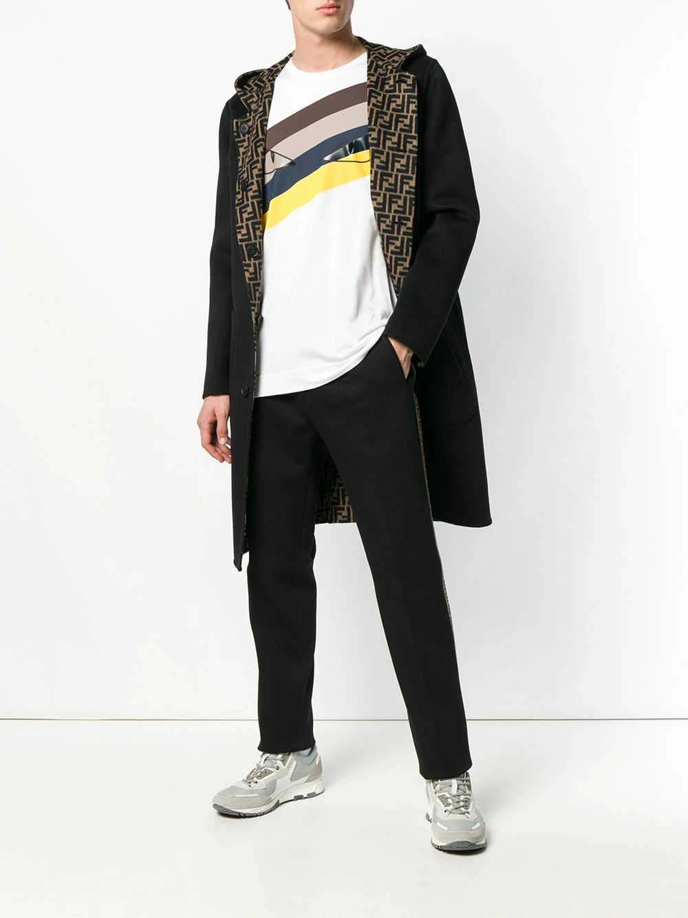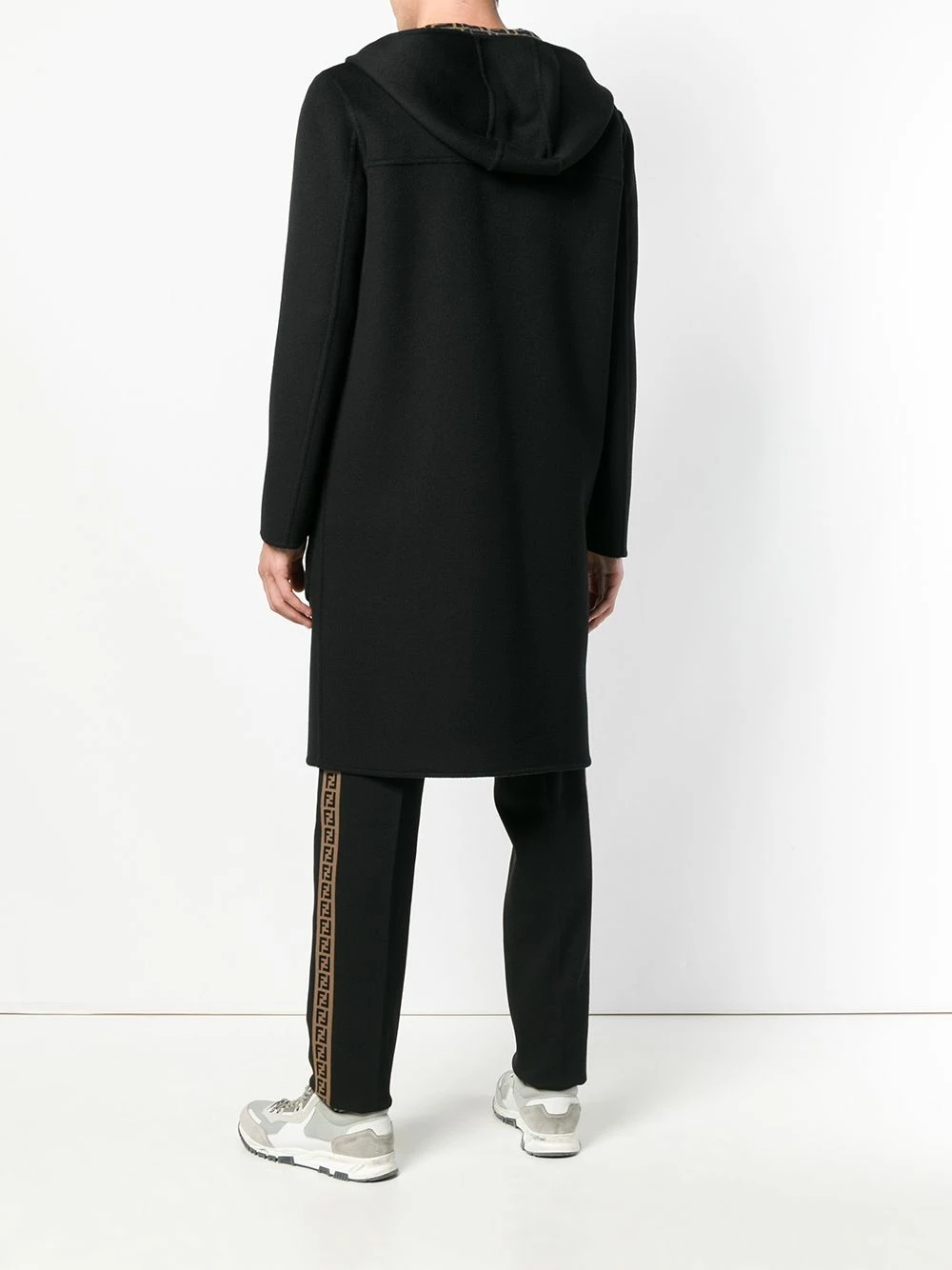 Feel comfortable and elegant with Fendiβs newest menswear collection. From cosy embroidered knitwear to fashionable printed shirts, the brandβs latest collection offers comfortable elegance for the modern men. This black virgin wool-silk blend hooded midi coat from Fendi features a front button fastening, long sleeves, two front pockets and a light brown lining with black FF logos.