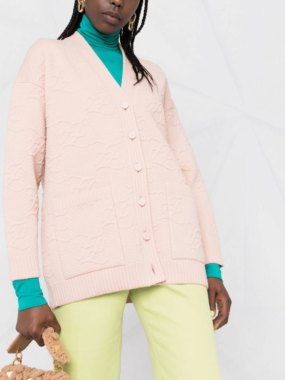Fendi is known for pairing innovative design with traditional construction techniques. Shown in this V-neck cardigan, its tonal, embossed monogram pattern is created with the use of quality materials and Italian craftsmanship.Β